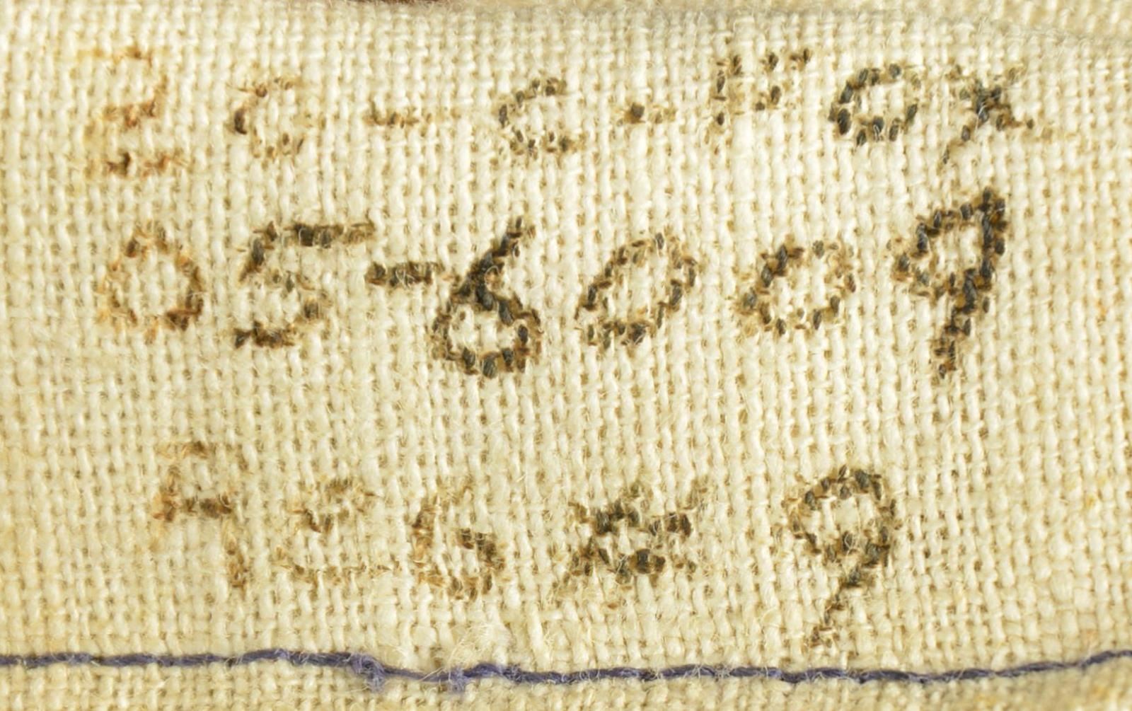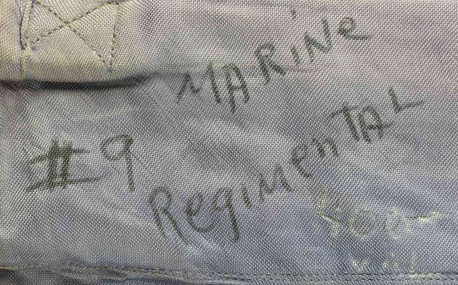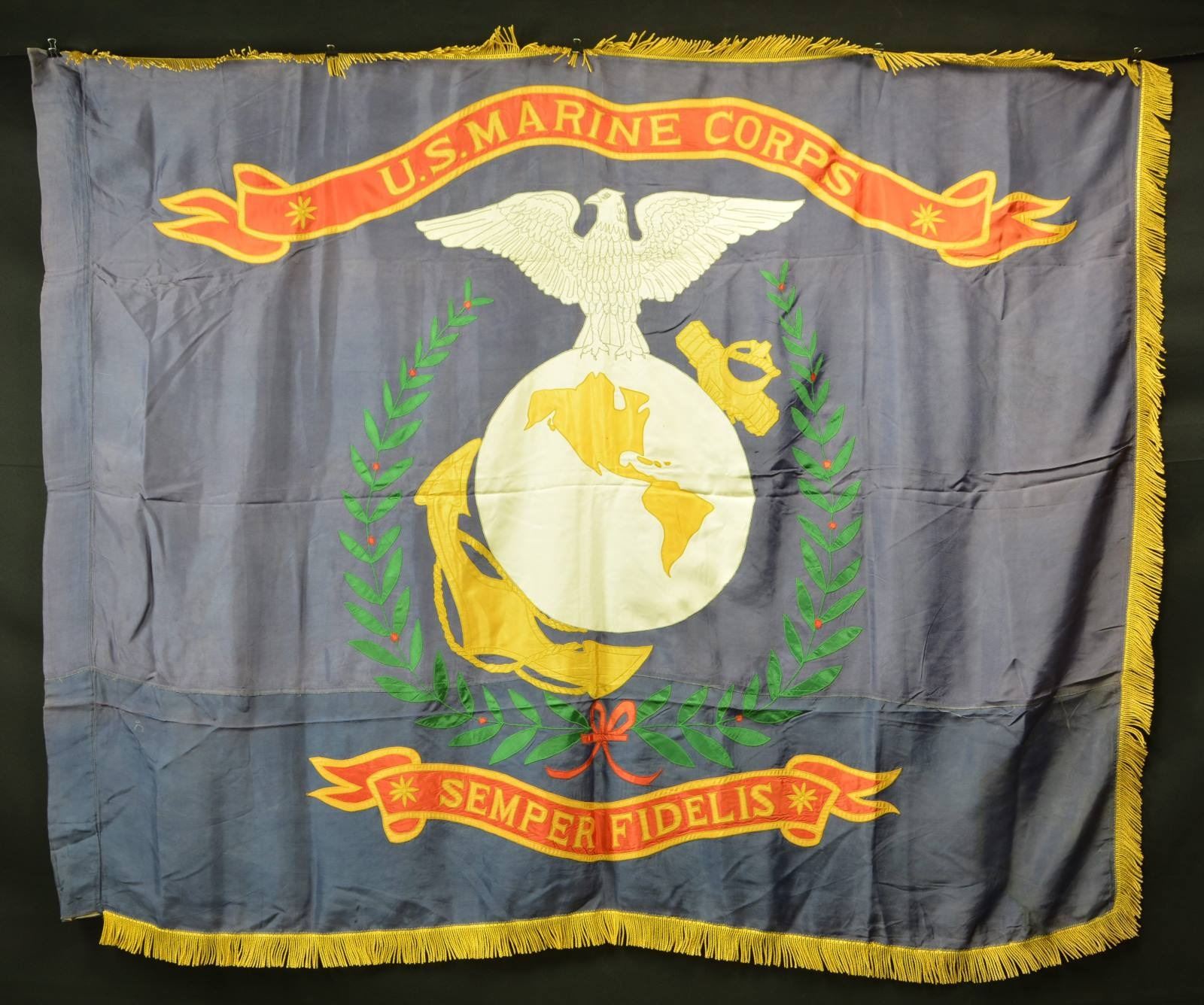 52" x 64" double applique embroidered on blue field with gold fringe. This is a wonderful example of the pre 1939 Marine Corps flag with a blue field, golden eagle and anchor and the globe in natural colors. 1939 regulations changed the field to red as it is today. No contract label, but inked text "Reg # 9". CONDITION: very good to fine, recent black marker writing on top 6" of sleeve hoist. (02-19473-19/JS). $200-300.