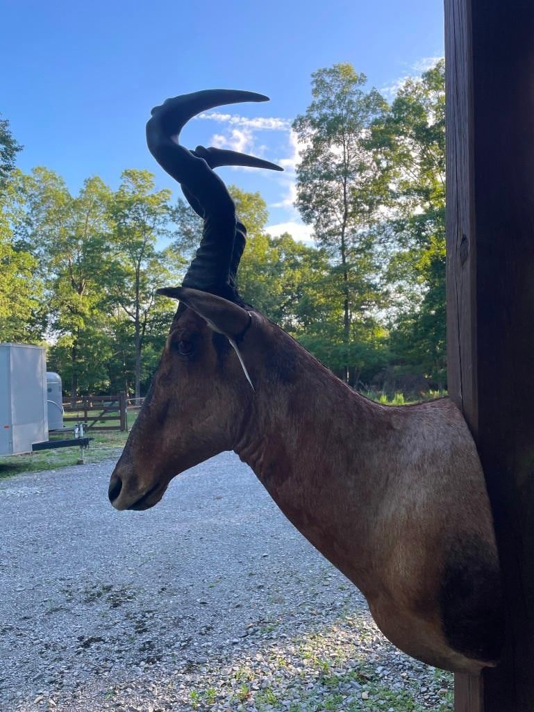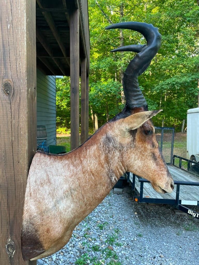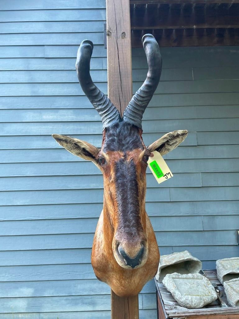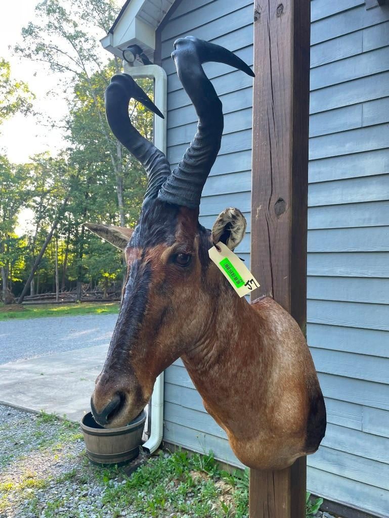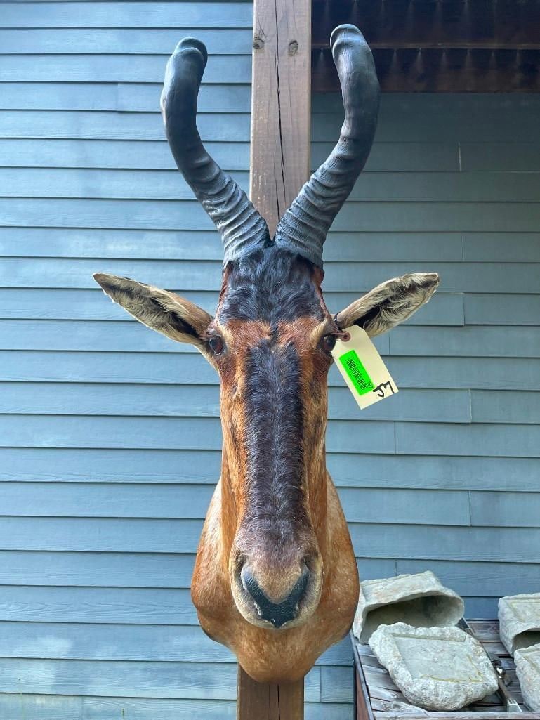 This is a Nice RED HARTEBEEST Shoulder Mount in Good Condition. It has Huge Horns that measure 23.5" Long (each) and an 11.5" Spread. The Horn Bases measure 11" around. The Total Mount measures 42" Tall x 27" Depth (from the wall). Beautiful "like new" TAXIDERMY.