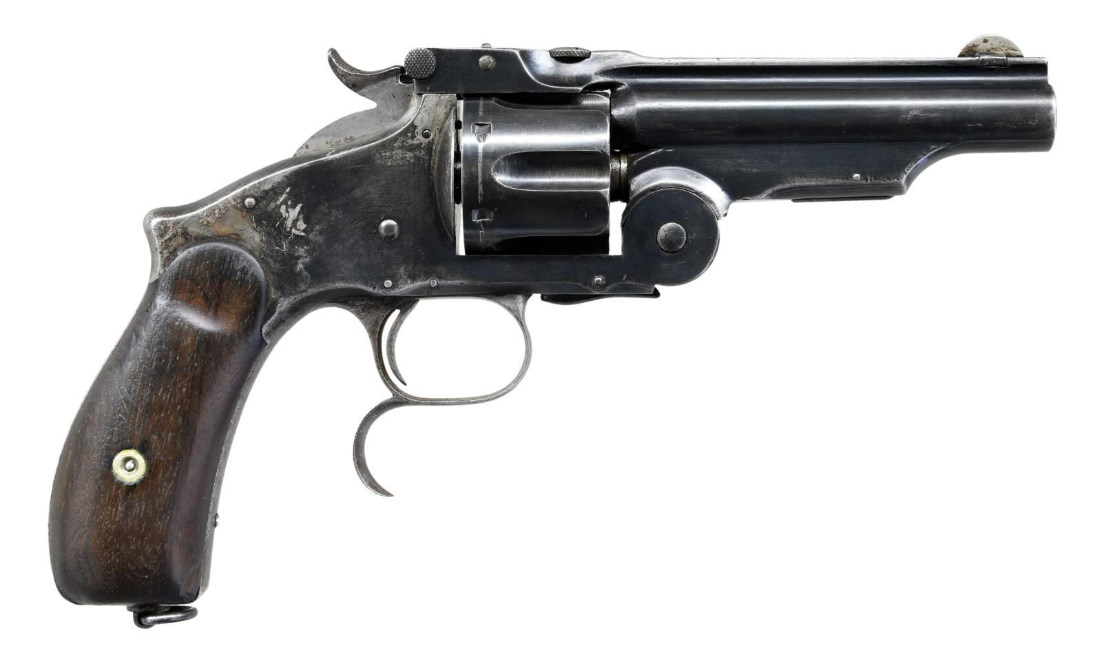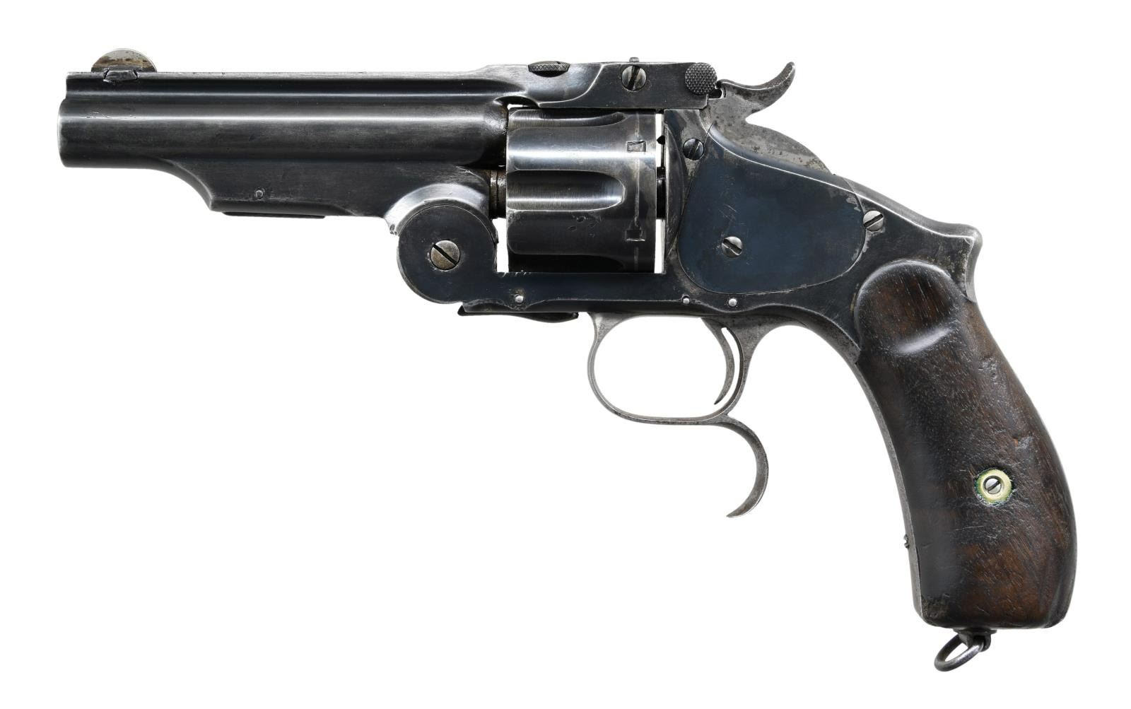 REVOLVER. Cal. 44 Russian. S# 6452 (1874). Bbl. has been shortened to 4 1/2" w/ German silver blade front sight dovetailed into rib obscuring markings. Rib marked "REISSUE JULY 25. 1871" (S# range 1-9000). Matching numbered top latch has large thumb screw. Matching numbered 6 shot fluted cyl. Finger spur trigger guard. Two piece smooth walnut grips w/ matching number on back of left panel ("2" has been renumbered over obliterated last digit). Butt of frame has lanyard ring & stamped "1874". CONDITION: over 60% reblued metal finish showing edge wear, prior pitting & large areas of worn finish mixing w/ patina on grip frame. Fair worn grips w/ large crack on back of right panel along w/ marks & impressions throughout. Bore has good strong rifling showing light pitting throughout. Action appears to function when cycled by hand showing slight play to lock up of cyl. (01-22628/MD). ANTIQUE. $400-600.