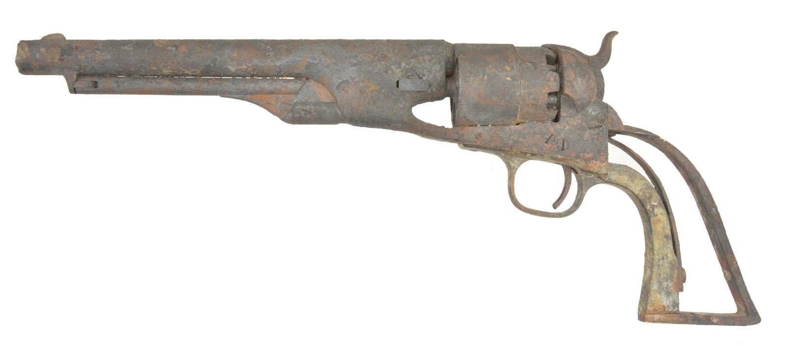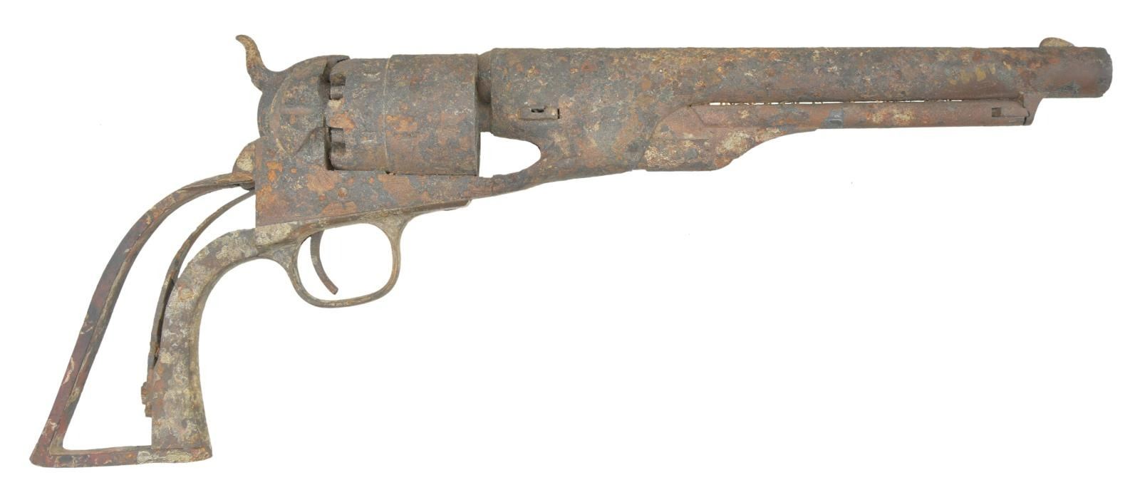 Cal. 44. S# 55499 (1862). Bbl. 8", 6 shot rebated cyl. Matching number on bbl., cyl., triggerguard, & back grip strap. CONDITION: metal has poor oxidized appearance w/ cyl. & loading lever frozen in place. Missing grip. PROVENANCE: From the Lifelong Collection of Glen E. Mattox. (01-22590/MD). ANTIQUE. $300-400.