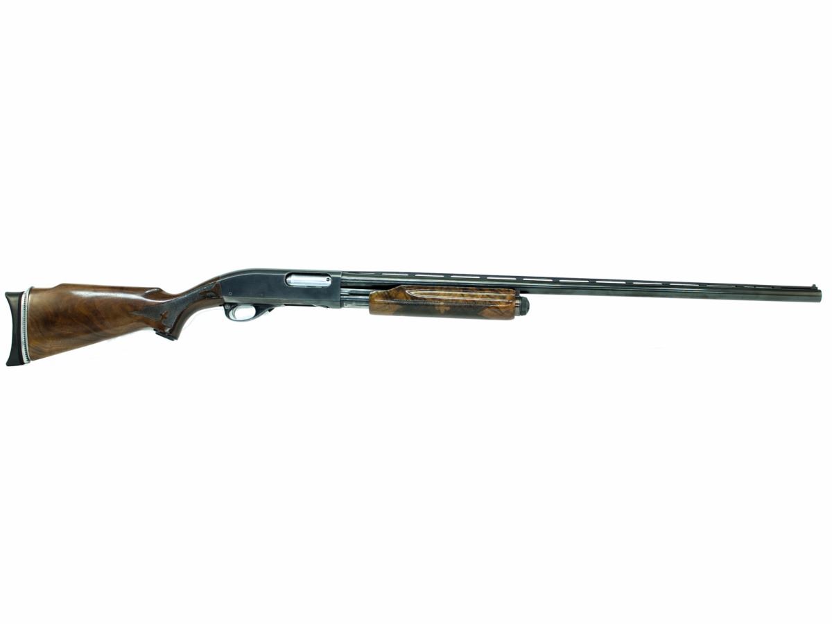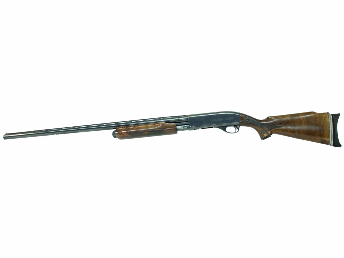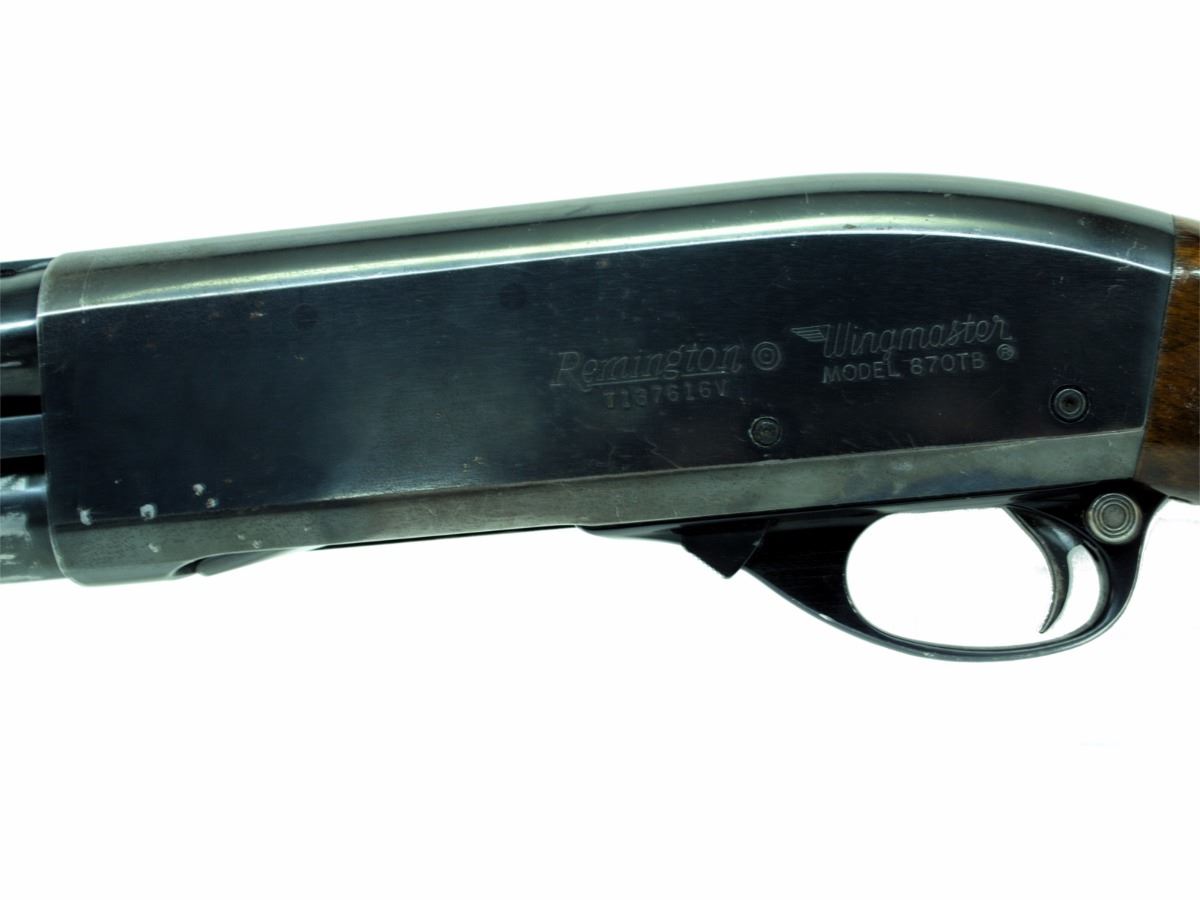 STOCK 1159-0066 G1, REMINGTON 870 TB WINGMASTER, PUMP ACTION, 12GA X 2 3/4", 30" VENT RIB TRAP BARREL WITH FIXED FULL CHOKE, WOOD REFINISHED BLUING IS WORN FROM CARRYING, BORE IS GOOD, ADJUSTABLE RECOIL PAD, CONDITION 8.5/10, SN. T1376XXX
