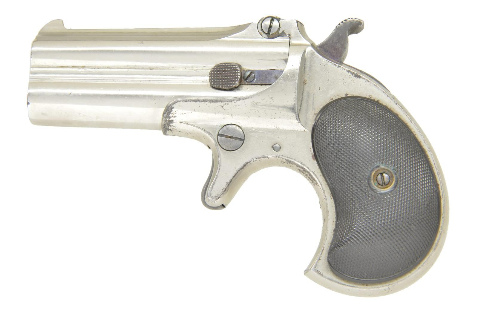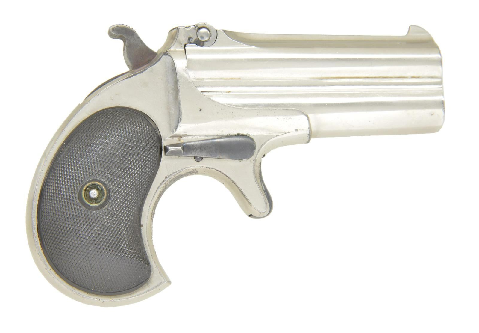 Cal. 41 RF. S# 909. Bbl. 3" w/ integral front blade plus 50mm line 6th, address having capitol letters w/ out spaced "CO." Mfg. 1904-1910 (unknown quantity) having nickel plating & reproduction border checkered black grips. CONDITION: very good appearance w/ some slight cloudiness to plating plus loss of finish w/ peppery appearance on front strap & by hinge (no crack or repair). Faded bluing on trigger, hammer, ejector & locking latch. Very good appearing grips w/ repair on left at lower rear. Proper mechanics to include alternating firing pin. Bores close to near excellent w/ appearance of light leading in corners of grooves. (23-235/NW). CURIO. $350-500.