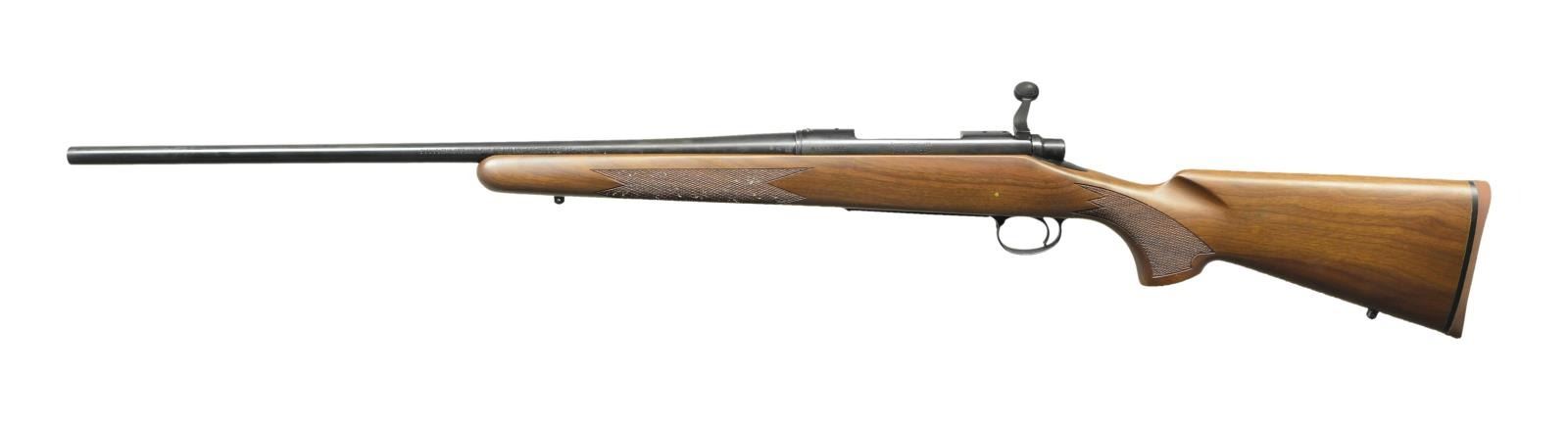 Cal. 25-06. S# C6553382. Bbl. 24". No provisions for sights; top of receiver is drilled & tapped for scope mount filled w/ plug screws. Metal is blued, hinged magazine, satin checkered stock w/ pistol grip, sling swivel studs & factory recoil pad. Jeweled bolt body. UNATTACHED ACCESSORIES: factory cardboard box S# to rifle w/ instruction manual. CONDITION: metal retains about 97% original finish w/ some storage wear & light oxidation. Stock retains nearly crisp checkering w/ some light scattered blemishes. Bore is near excellent, bright & strongly rifled. (23-151/CW). MODERN. $700-900.