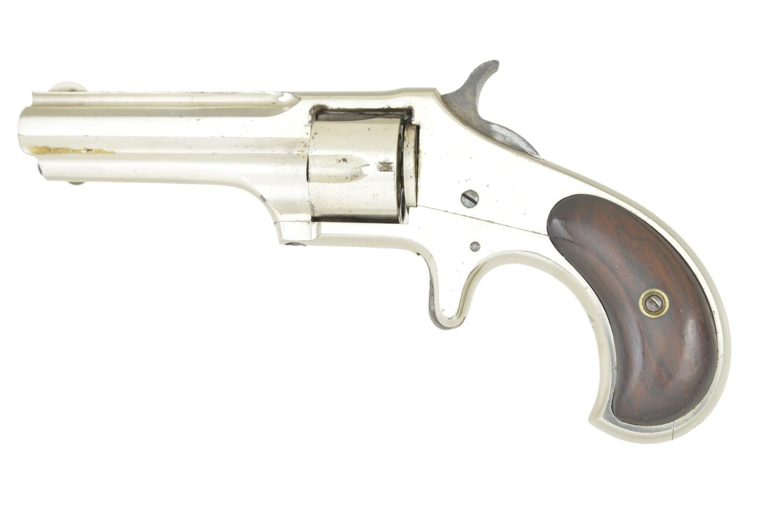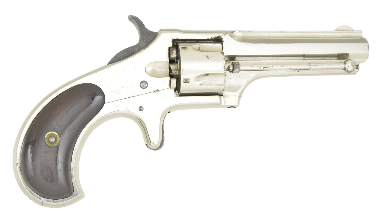 Cal. 30 RF. S# 2441. Bbl. 2 13/16" octagon with rib having semi circular blade sight. Mfg. 1875-1877; approx. 3,000 units. Unnumbered 5 rd. cyl. is 13/16" long. Smooth rosewood birds head grips and nickel plated (offered in silver plate too). Later variation (approx. 2,300) with fixed, non rotating recoil shield and proper stepped ejector rod. Unusual design were frame is split longitudinally with barrel integral to top half of revolver and spur trigger assembly in bottom; both matching numbered. CONDITION: very good to excellent appearance with minimal marks and occasional small spot of plating loss. Very good grips with some slight handling marks on right. Crisp, proper functioning action. Fair to good bore with areas of pitting. PROVENANCE: From the Lifelong Collection of Glen E. Mattox. (01-22450/NW). ANTIQUE. $300-400.