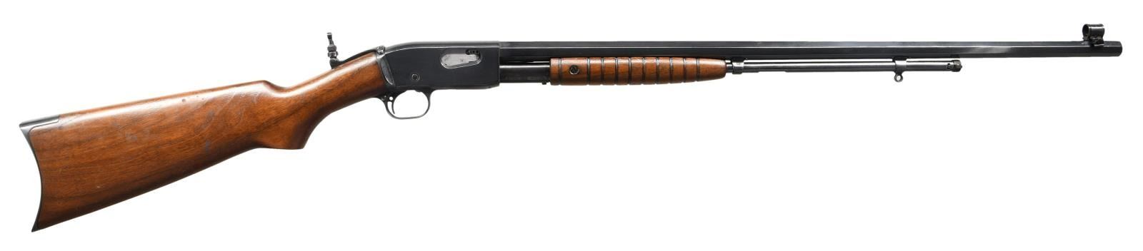 RIFLE. Cal. 22 S, L, & LR. S# 430388. Bbl 24". Reapplied blue finish with smooth wood buttstock and grooved wood pump. Full length octagonal barrel. Layman globe front sight with Lyman flip-up aperture rear sight. CONDITION: Very good as refinished, with areas of mild pitting present beneath the finish. Mirror bore, exhibiting strong rifling throughout. Wood furniture exhibits some scattered superficial marks from storage and handling, but is otherwise fine. (23-1925/MLW). CURIO. $300-400
