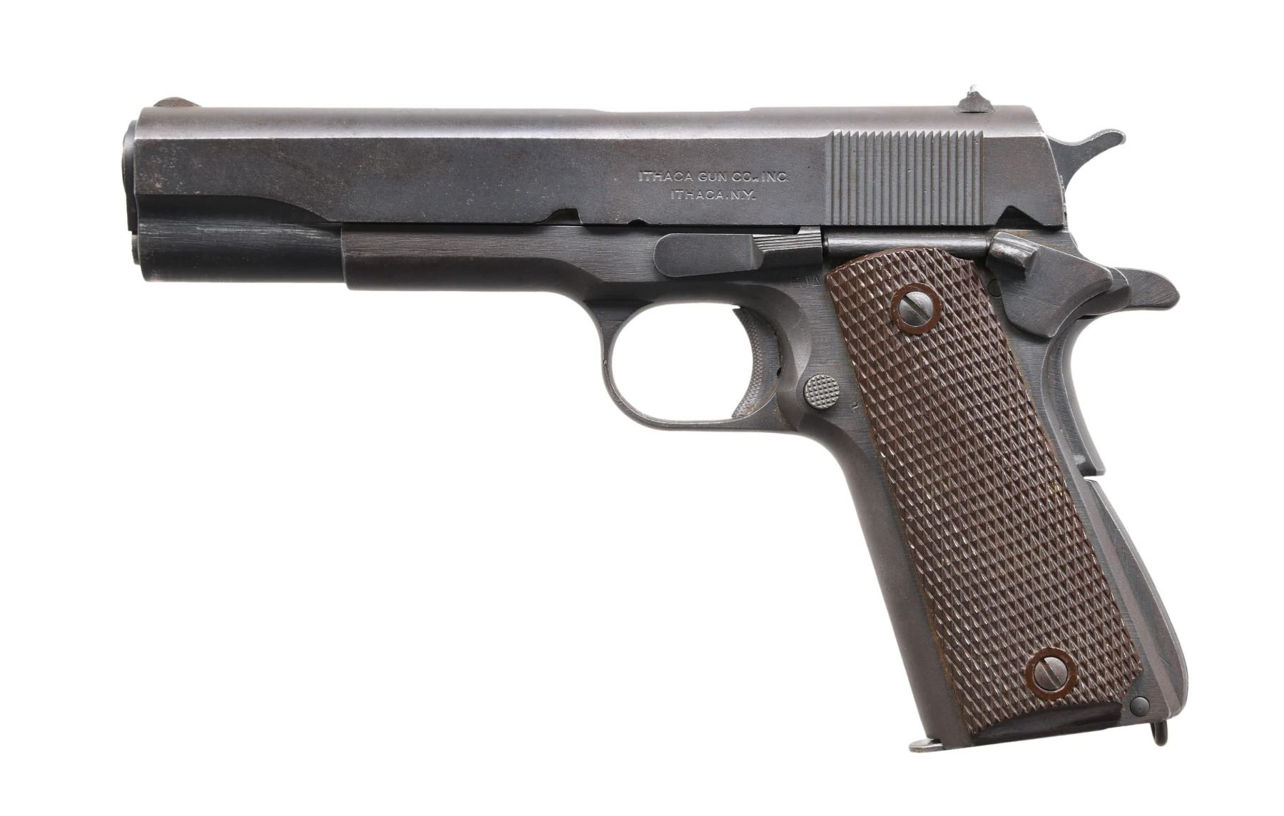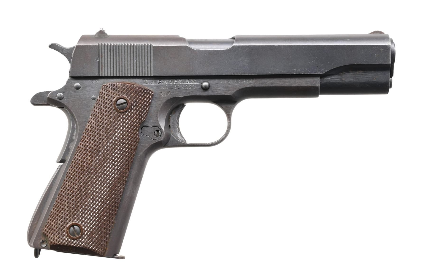 PISTOL. Cal. 45 ACP. S# 1314891. Frame originally mfg. by Remington Rand in 1943 (S# range 1279699-1441430). "RIA" stamp on right side of frame indicates Rock Island Arsenal rework. Correct parts include High Standard 5" barrel, Type E hammer, Type C slide lock, Type C safety tab. Replacement parts include: Ithaca slide, Type 4 Mainspring housing, loose fitting barrel link & pin, Coltwood left grip panel & brown plastic right panel. MAGS: 1 two tone 7 rd. CONDITION: pistol has arsenal bead blasted parkerized refinish over areas of prior pitting showing patina & wear. Good grips. Very good bore with strong rifling. (24-5137/MD). CURIO. $1,500-2,000.