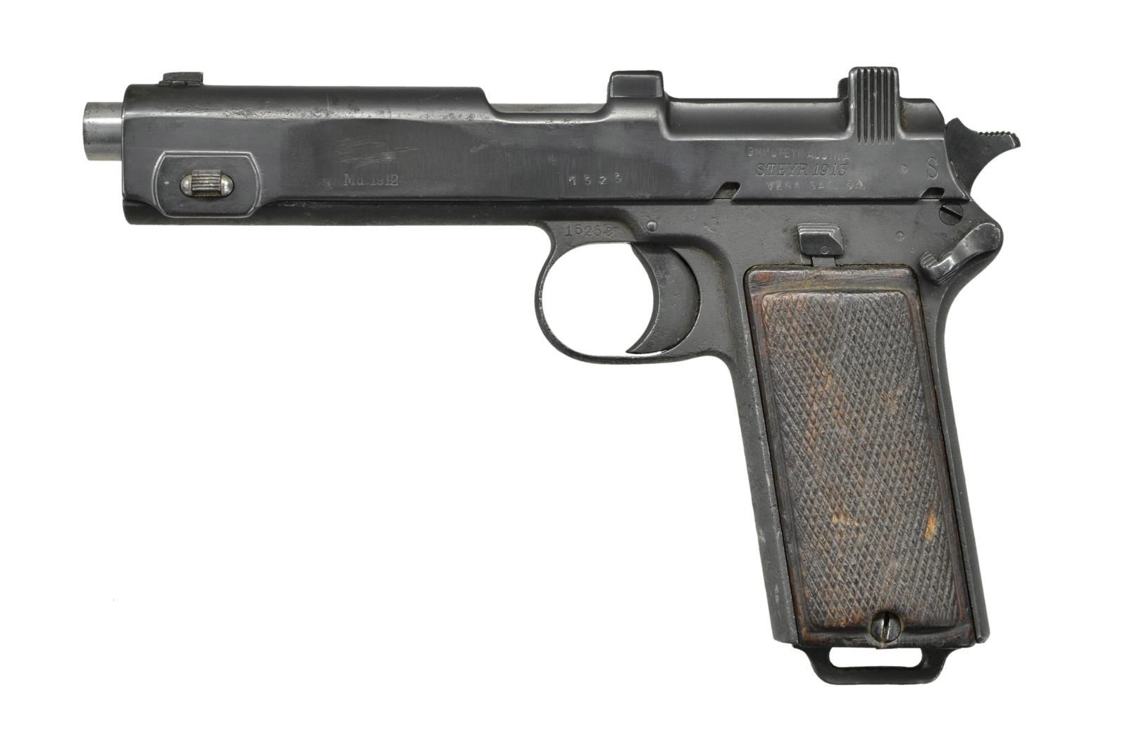 Cal. 9mm Luger. S# 1525e. Mfg. 1913 & 1914 by Steyr for Romanian military. Matching S# bbl. (electro engraved; originally "1219c") & slide dated 1913 w/ Romanian crest (removed) over "Md 1912". Border checkered grips over 8 rd. internal magazine loaded by stripper clips. Right side of triggerguard with Austrian proofs. VEGA of Sacramento, CA import stamp on left rear of slide. CONDITION: fair overall appearance as refinished over pitting; fame appears matte plus slide heavily polished. Hand worn grips with patina finish. Pore bore w/ heavy wear and only traces of rifling. Hand cycling not smooth and stiff trigger pull. (23-1030/NW). CURIO. $300-450.
