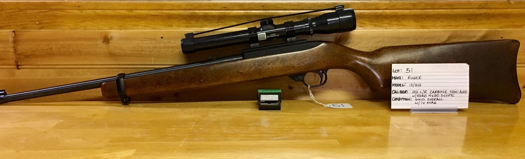 LOT: 51 MAKE: RUGER MODEL: 10/22 CALIBER: .22 L/R, CARBINE, SEMI AUTO EXTRAS: RUKO 4X20 SCOPE CONDITION: G, W/ 2X MAG S/N: 124-36788
