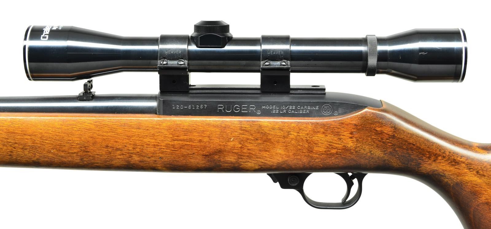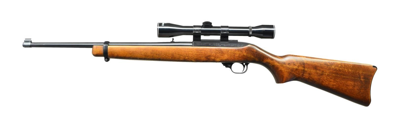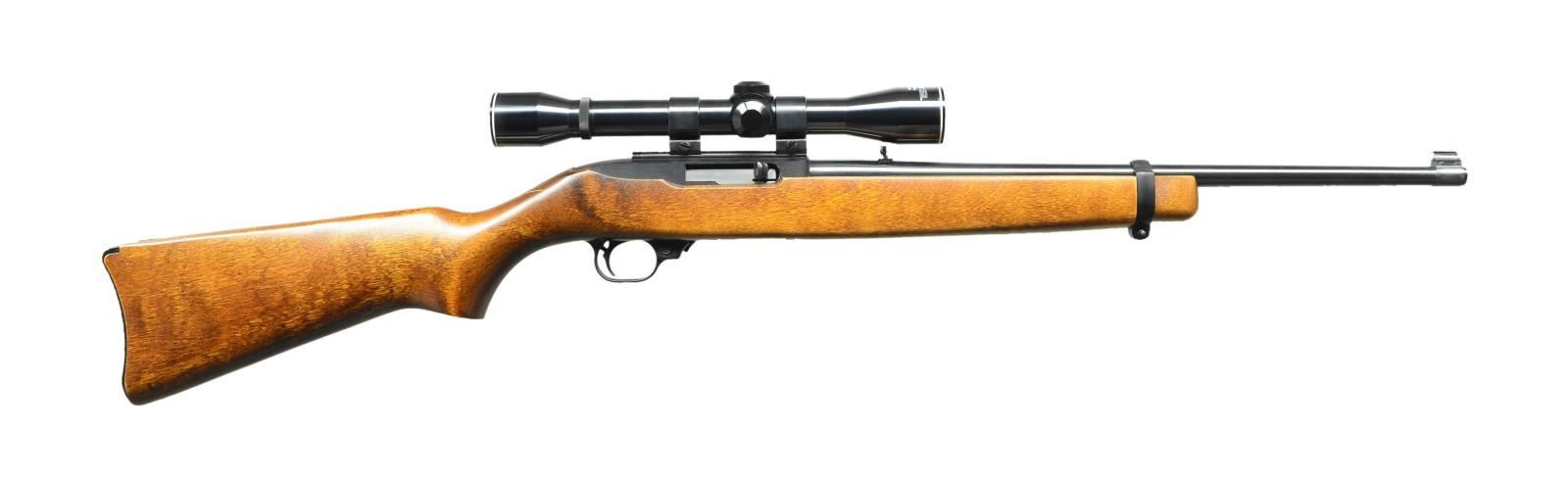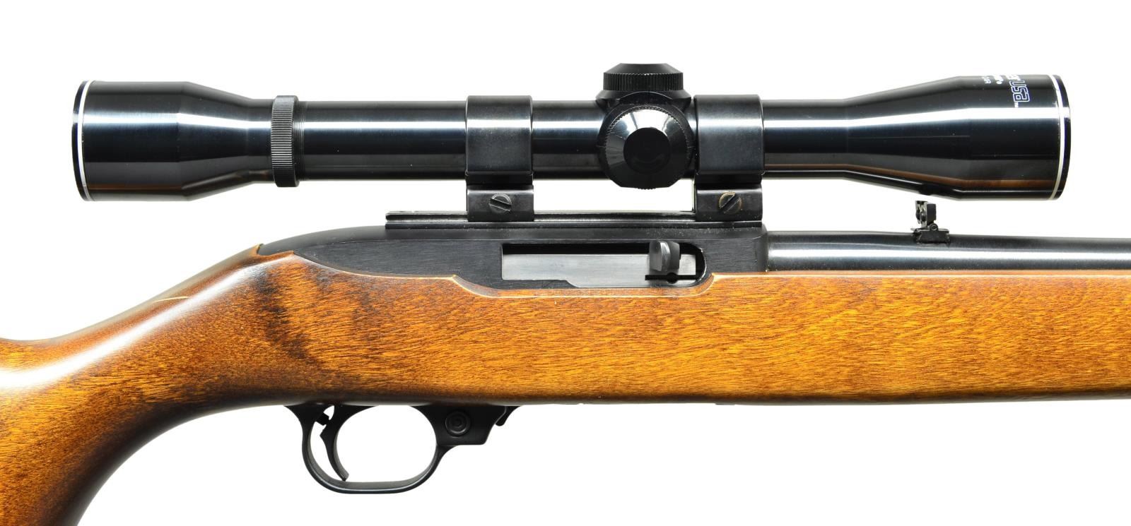 Cal. 22 LR. S# 120-61267. Bbl. 18 1/2"; brass bead front sight & folding leaf rear. Mfg. 1980 w/ stained hardwood stock having black Celcon buttplate. Factory scope adapter base installed w/ Weaver Tip-Off rings holding Weaver steel tube 4X32 Challenger scope having duplex reticle. MAGS: 1 factory 10 rd. CONDITION: very good to excellent overall appearance w/ light handling marks on stock having refinished look. Metal surfaces near excellent including scope. Near excellent bore & ;optics. (23-131/NW). MODERN. $250-350.