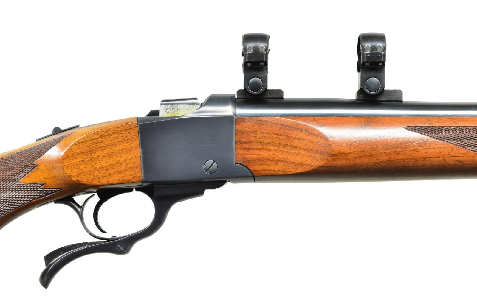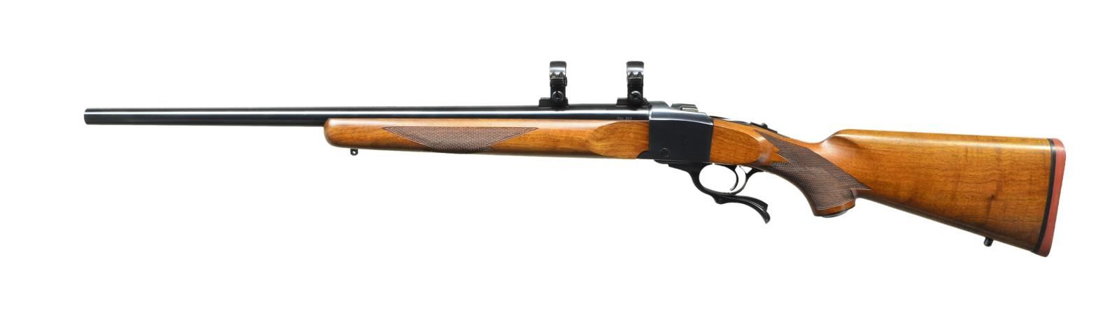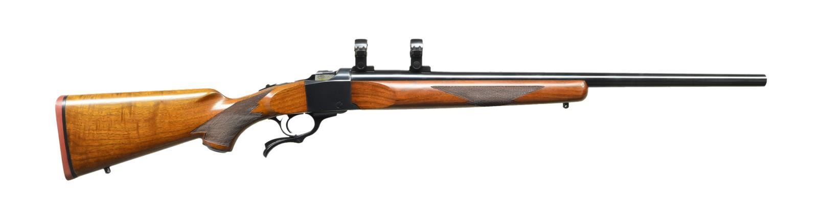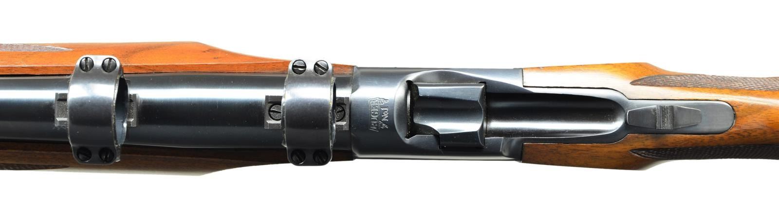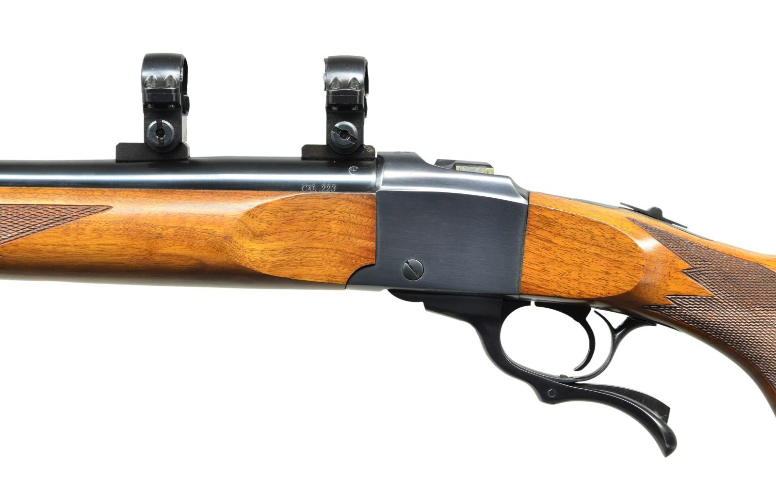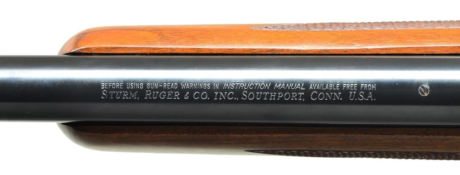 Cal. 223 Rem. S# 132-86926. Bbl. 24" varmint weight w/ factory recessed target crown, factory scope bases having high Ruger 1" rings plus factory drilled & tapped for Unertl style target blocks. Mfg. 1989 (1967-date) w/ checkered walnut stock set having sling studs, grip cap & red pad. CONDITION: all aspects near excellent including bore. (23-309/NW). MODERN. $750-1,000.