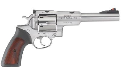 Ruger, Super Redhawk, Revolver, Double Action, 10MM, 6.5"Barrel, Satin Stainless Finish, Rubber with Hardwood Insert Grips, 6Rd, Adjustable Rear Sight & Fixed Red Ramp Insert Front Sight, 3 Full Moon Clips