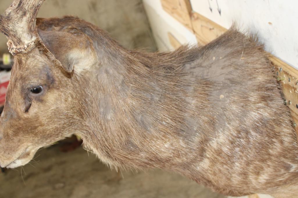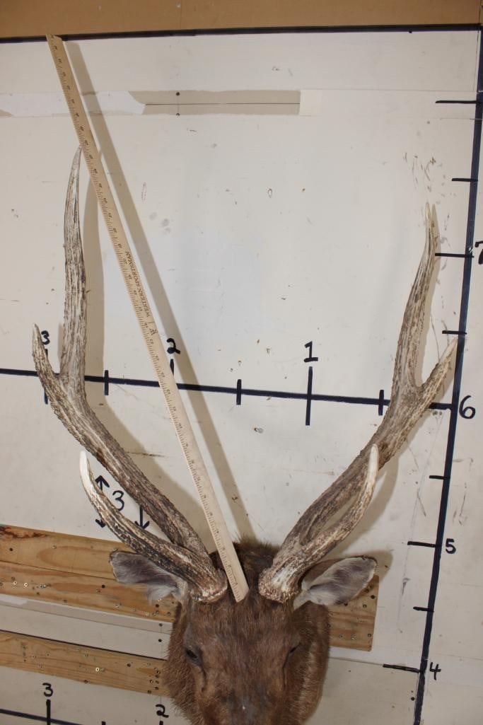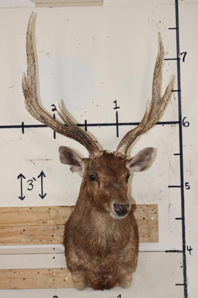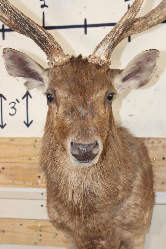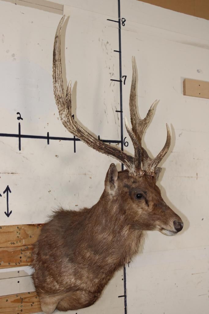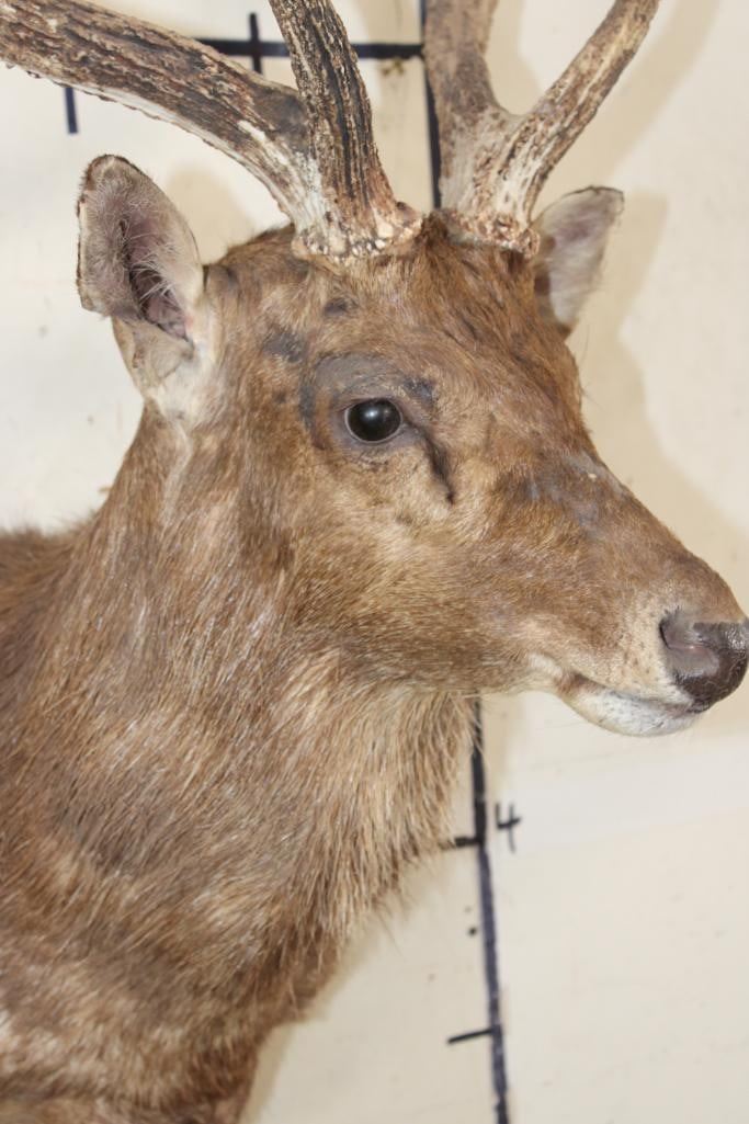 Nice RUSA DEER Shoulder Mount. It has a Heavy 6-Point Rack and a 26 5/8" Rack. TAXIDERMY