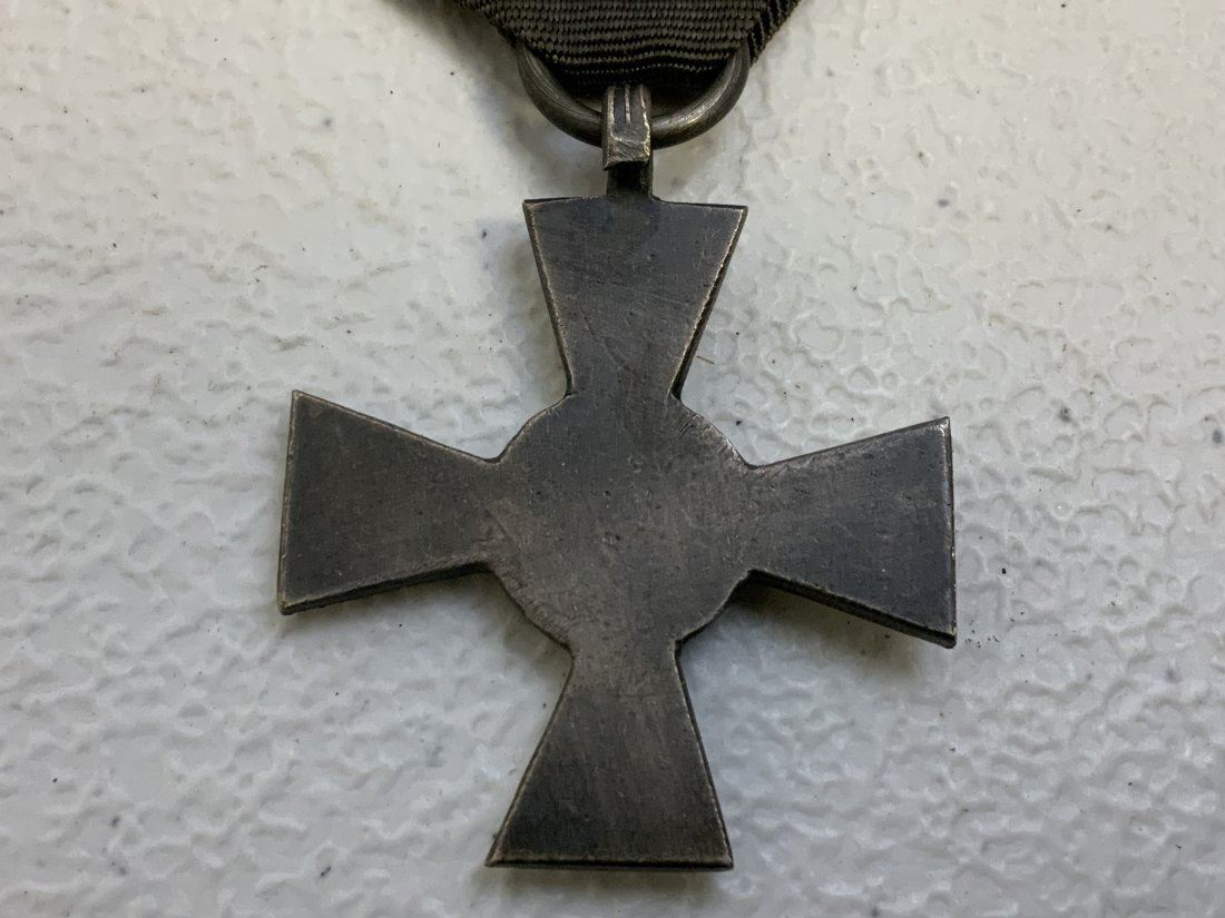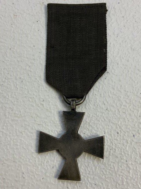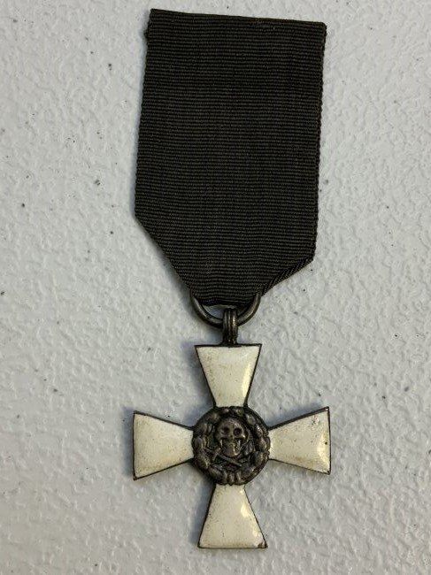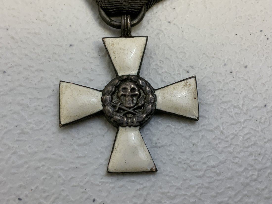 RUSSIAN CIVIL WAR WHITE ARMY GENERAL BULAK - BULAHEVICH SCULL CROSS MEDAL AWARD . WHITE ENAMELED CROSS WITH SCULL AND CROSSED SWORDS IN THE CENTER . GREAT CONDITION ON ORIGINAL BLACK RIBBON . RARE .