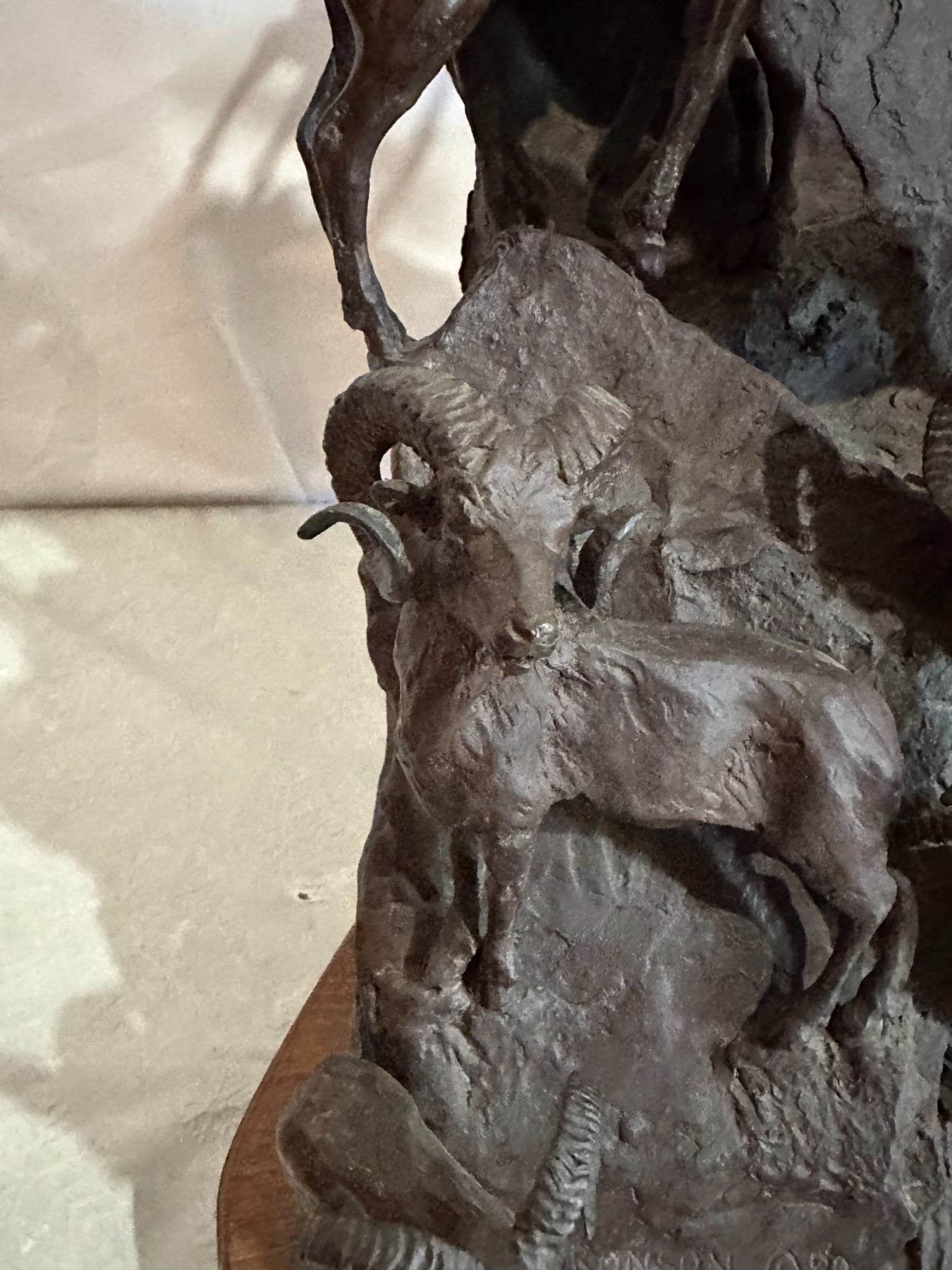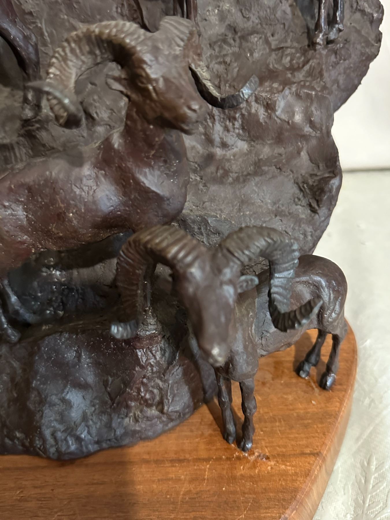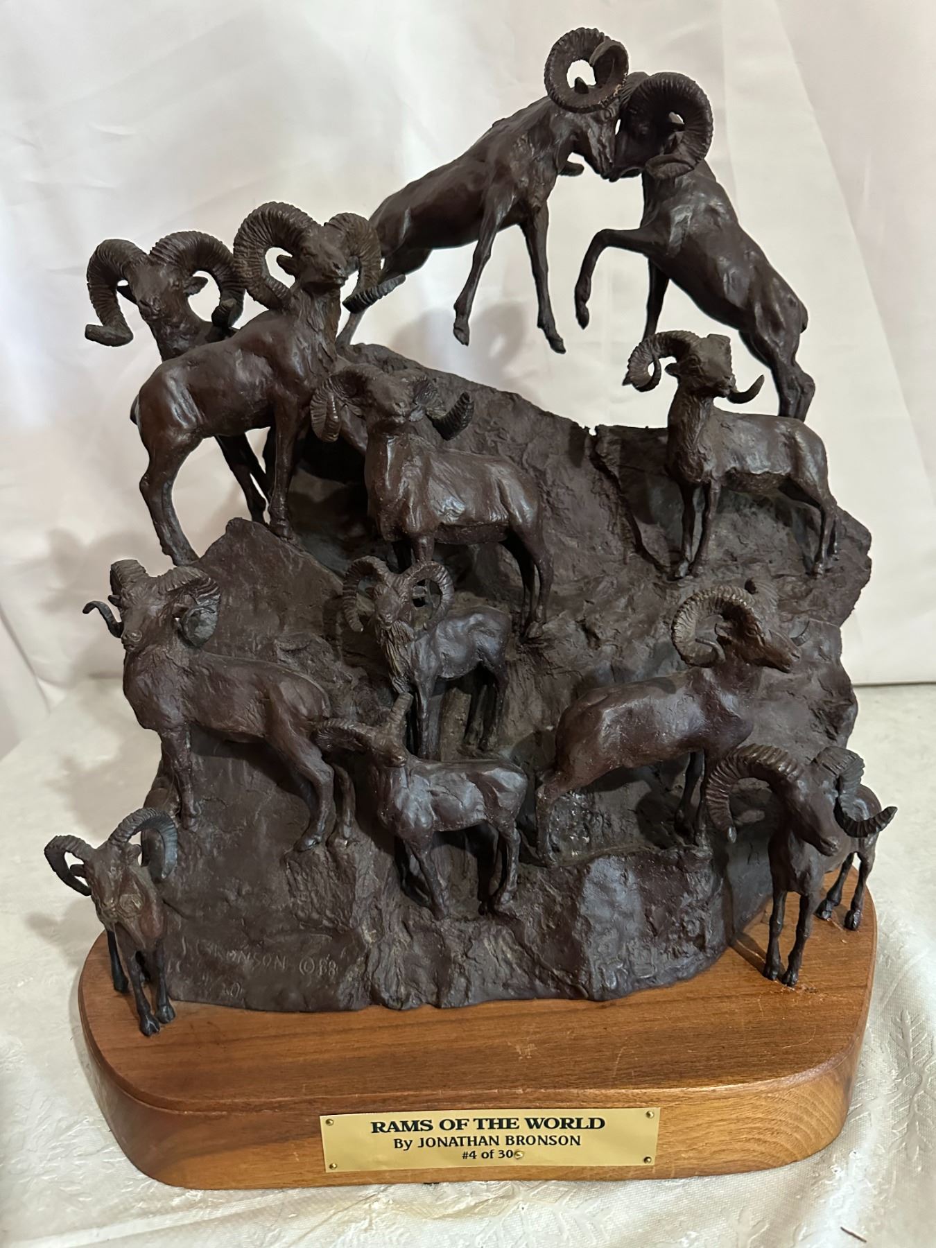 Original BRONZE Sculpture by Jonathan Bronson, Numbered #4/30 and Signed "Bronson 88". This Extra Large Bronze sculpture has 2 Big Marco Polo Sheep Ramming heads at the top of a mountain and 12 total sheep! It is mounted on a Wooden Base and measures 17.5" Tall x 15" Long x 12" Depth from Wall. Weight 34 Pounds.