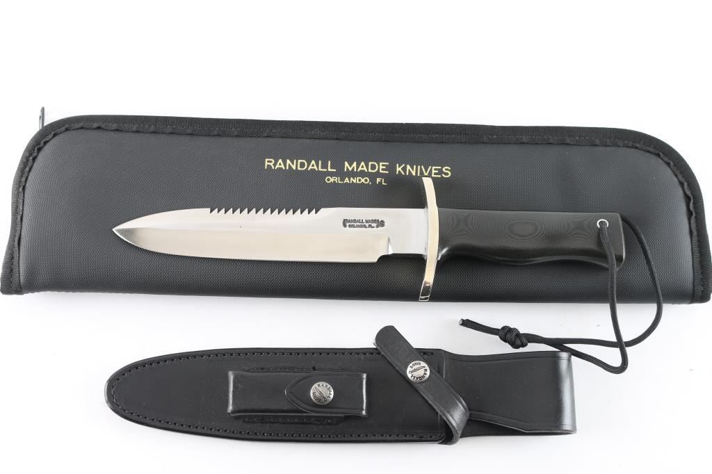 Model 18 Attack Survival. 7 1/2" of 1/4" stock. Saw tooth edge on top (saw teeth not offset). Double nickel forward curve hilt. Approximately 4 3/4" black Micarta grip w/wrist thong through nickel ferrule. Comes with black leather sheath and sharpening stone.