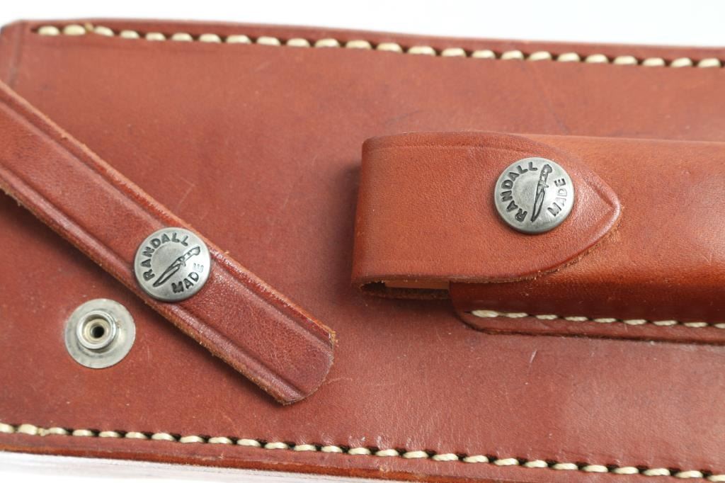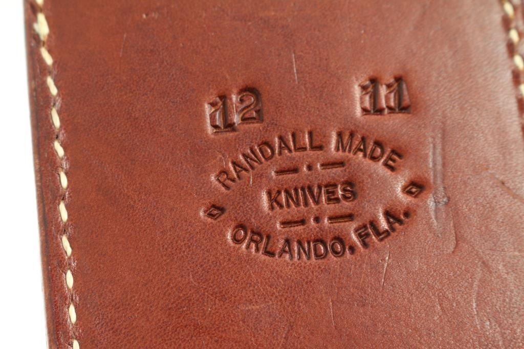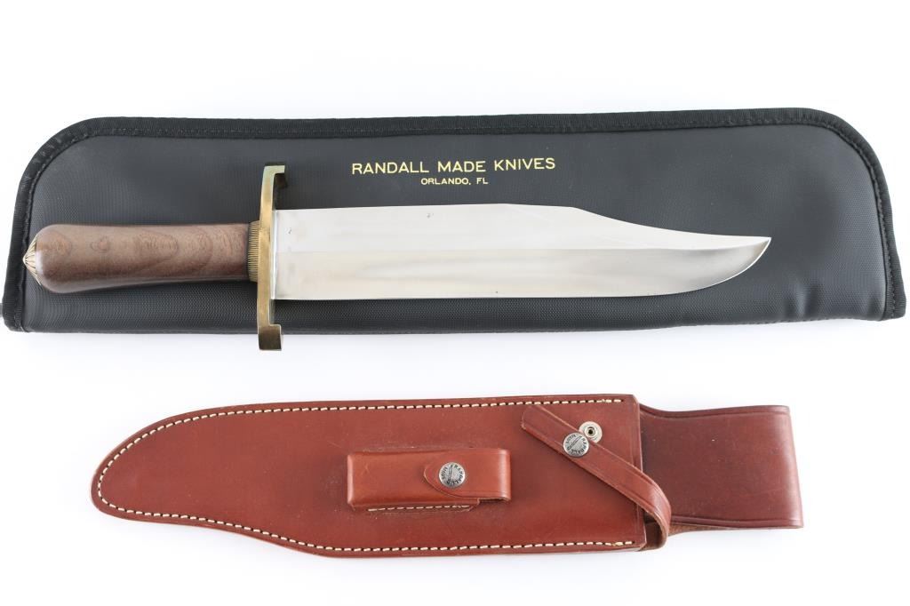11" blade of 3/8" stock. The top cutting edge is sharpened approximately 4 3/4”. Brass lugged hilt. Approximately 5 1/4" Burl wood handle. Brass umbrella butt cap. Comes with tan leather sheath and sharpening stone.