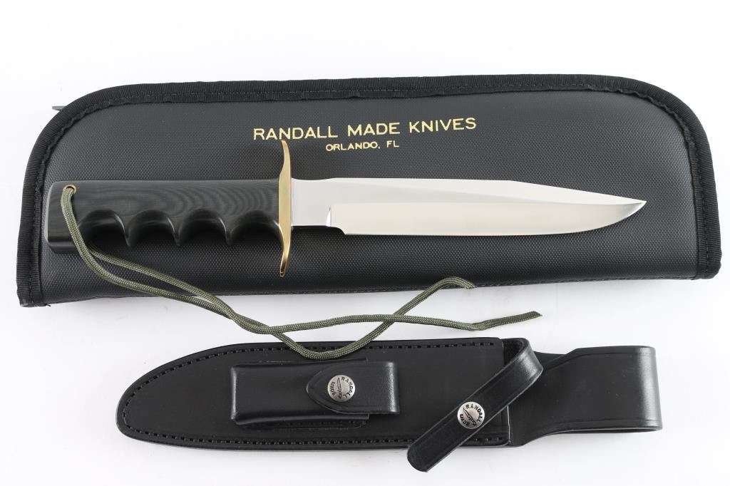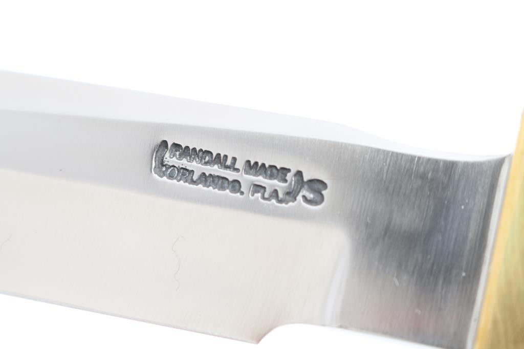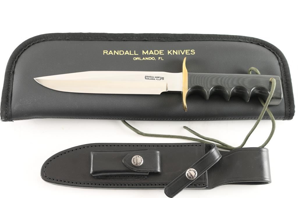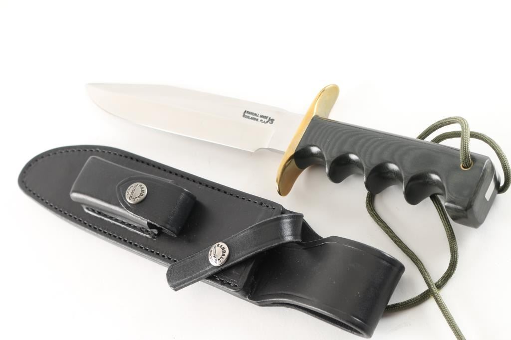 Model 16. 7" blade of 1/4" stainless steel stock. The top cutting edge is sharpened approximately 3". Brass double hilt. Approximately 4 1/2" durable Black or Green Micarta finger grip handle. Extra-heavy 7/8" wide tang extends through a channel in the handle, which is firmly fastened with epoxy. Wrist thong through brass ferrule in the handle. Comes with black sheath and sharpening stone.