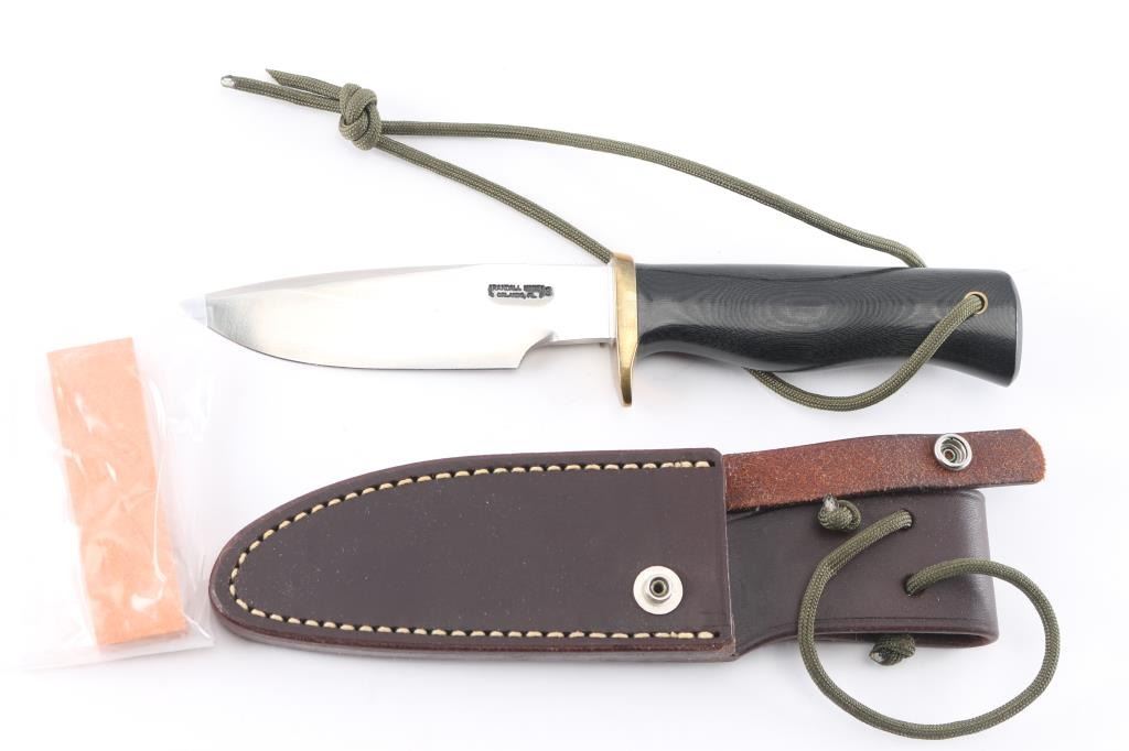 Model 28. 4 1/2" blade of 3/16" stainless steel stock. Drop point hunter blade. The top of the blade is notched for thumb placement. Single brass hilt. Approximately 4 1/4" handle length. Green micarta border patrol handle. Full tang handle construction. Wrist thong with a brass ferrule. Sturdy overall construction. Excellent skinning and outdoor knife. Comes with a Model B sheath & sharpening stone.