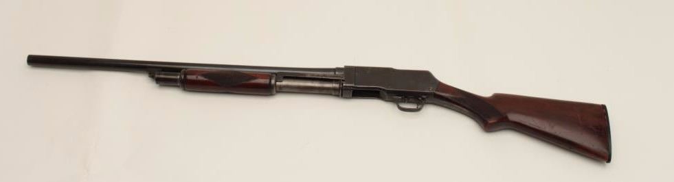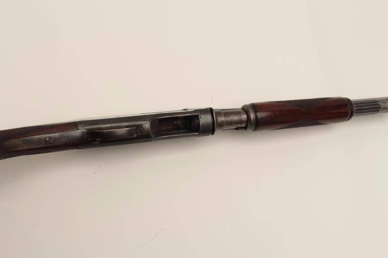 Ranger pump action repeating shotgun, 12 gauge, 25” barrel, blued finish, checkered wood stocks, S/N 44437, in overall very good condition displaying the majority of its original finish, very good to near fine bore, crisp action, sharp markings and good wood showing scattered mars and scratches from storage plus replaced hard rubber butt plate. (C&R). Est.: $150-$300.