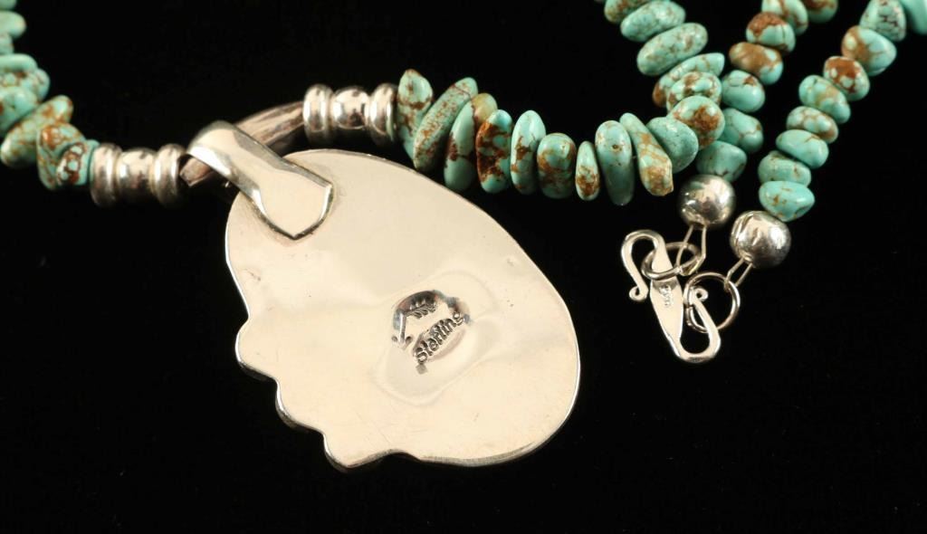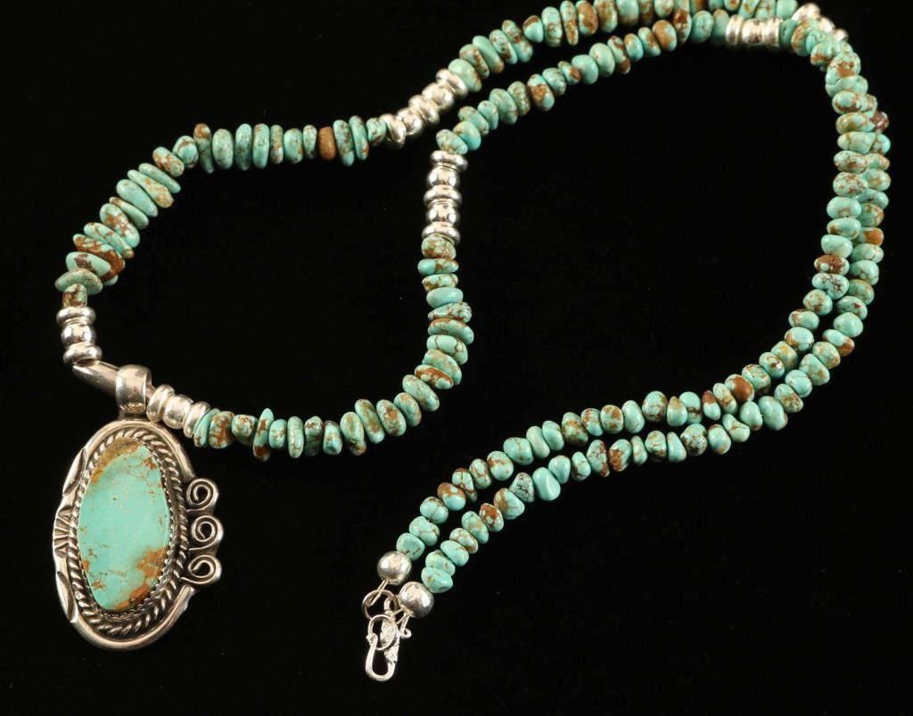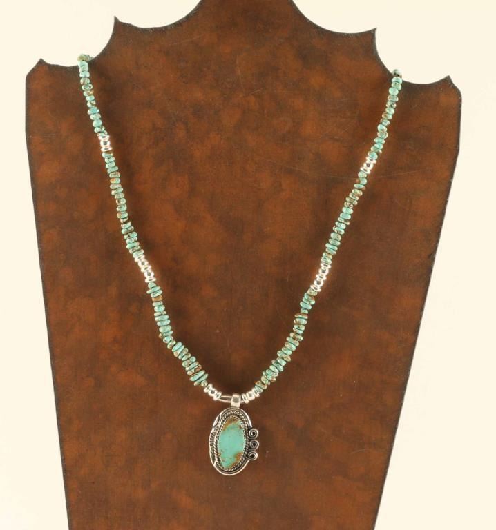 pendant is set in sterling, necklace is tumbled nugget beads, pendant has an arrow hallmark.22"long 27.6g total weight made by Kay Johnston.