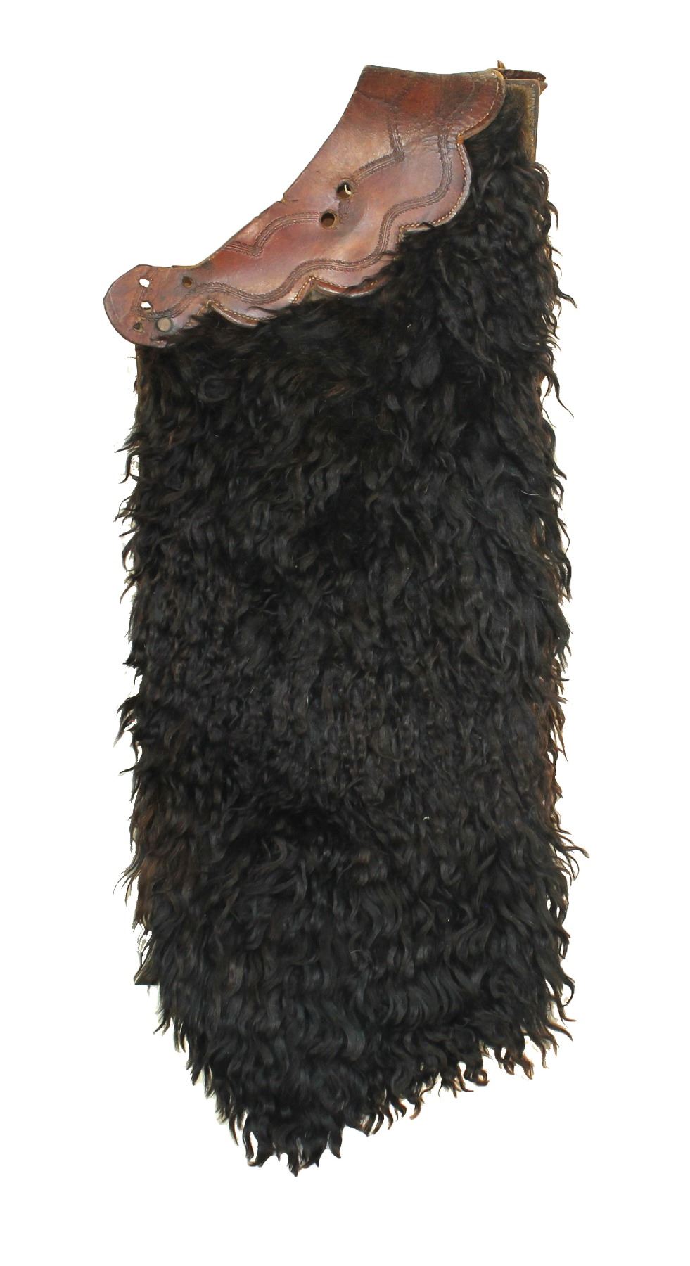 Rarely seen pair of 21" long black angora serape style saddlebags, with large panels of wonderful long twisted black hair anf light colored leather pockets.