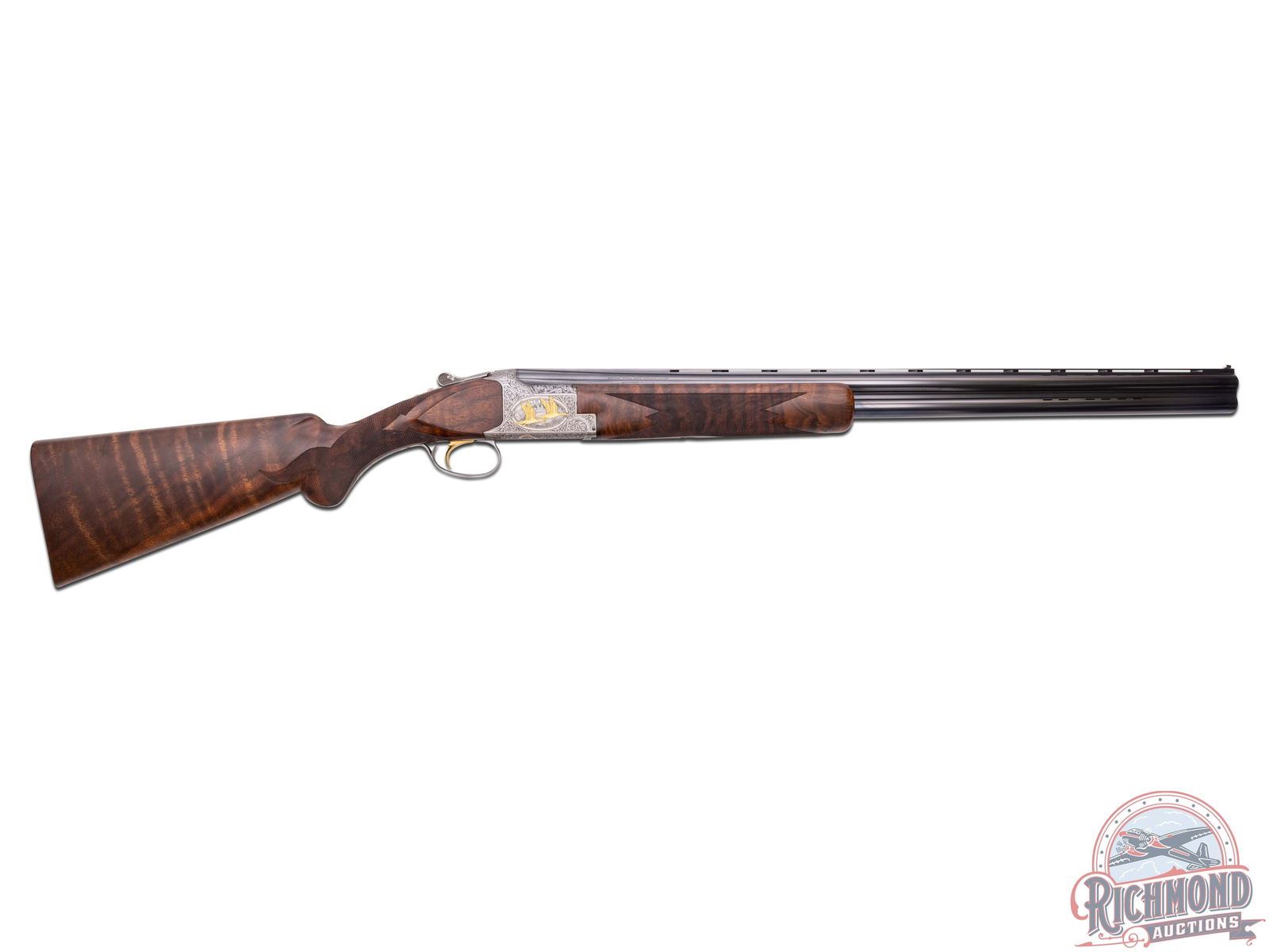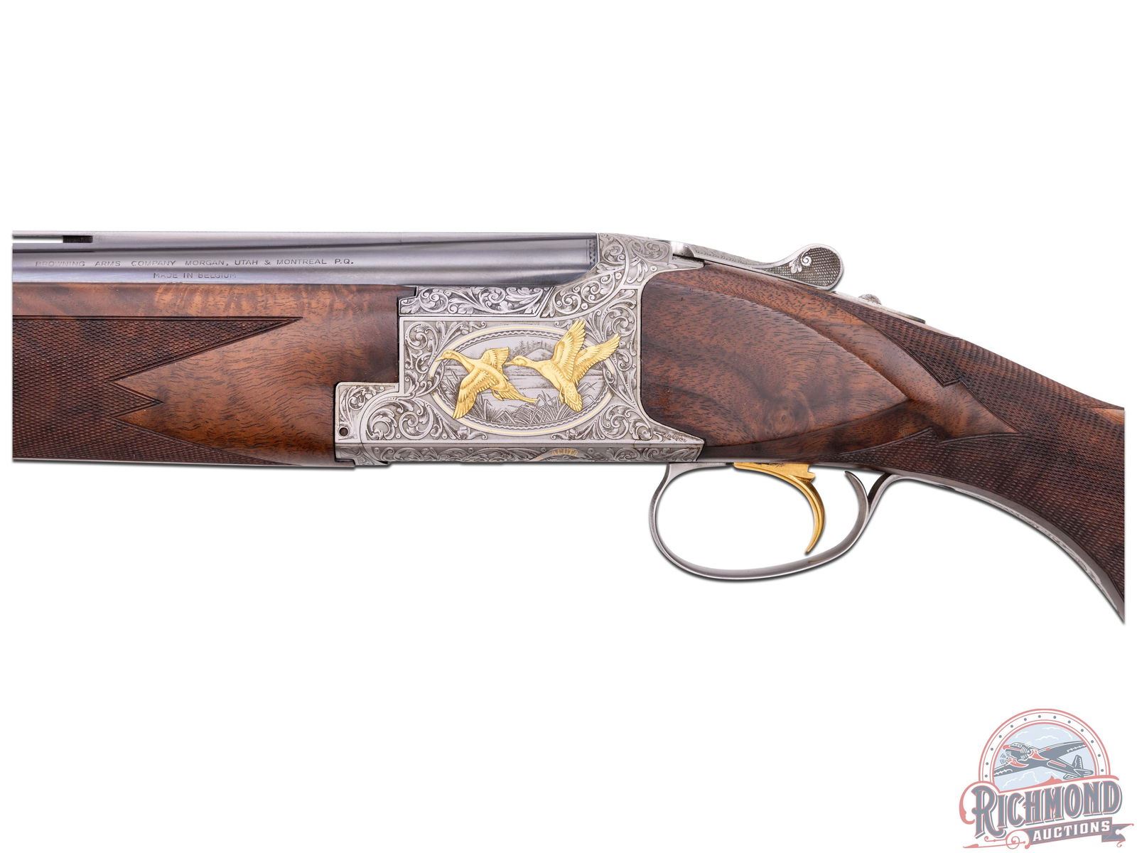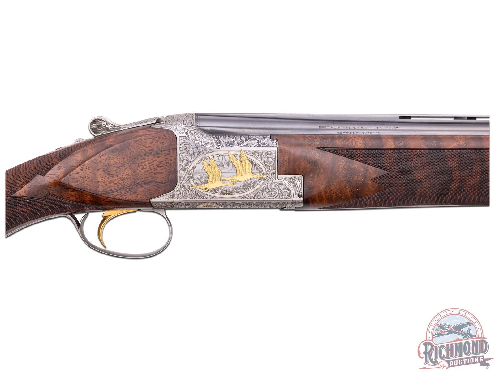 Made in Herstal, Belgium by Browning in 1981 and marketed only in 1982 until supplies were gone in 1982. This gun is number 100 of 500 made of this edition. 28" blued Ported Special Steel barrels with ventilated rib, twin bead Hi-Viz sights, ejectors, and Invector chokes. Barrel has Browning Utah and Montreal address markings, along with steel and patents in 12 gauge caliber with 2-3/4" chambers. Satin gray finished receiver with floral engraving done by Jose Baerten with right side having a floral background with two gold ducks in flight with oval scene having a gold line border. Left side features two gold ducks in flight in oval gold border with panel signed "J. Baerten". Bottom has two gold ducks with floral background with "Pintail Anas Acuta" phrase in gold with "100 of 500" in gold. Action has gold washed single selective trigger with top tang safety and selector. Trigger is protected by satin finished floral trigger guard with gold "Duck Head" on bow. Walnut figured fine checkered round knob long tang pistol grip stock in floral pattern with skip-line checkered wood butt. Matching sporting style attached checkered forearm with latch release. Comes in fitted black walnut case with brass hardware and extra Invector choke tube and wrench. LOP: 14-1/4". DAC: 1-1/2". DAH: 2". CALIBER: 12 GA. S/N: 8H4PZ00100. FFL STATUS: Modern.