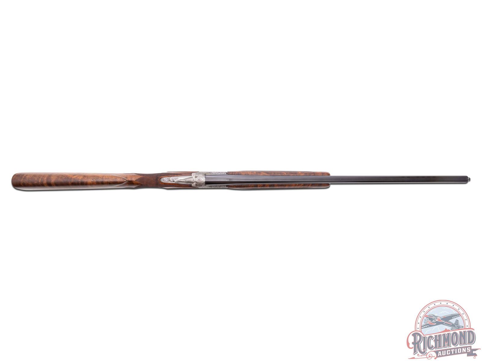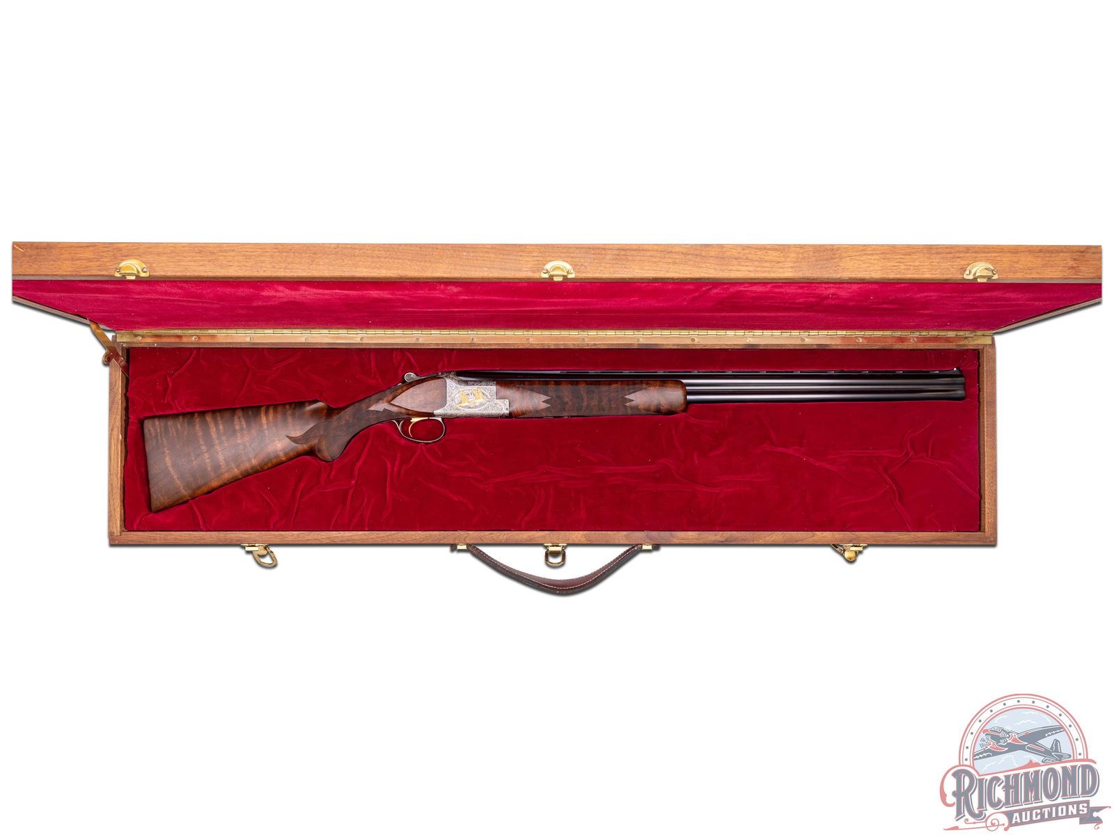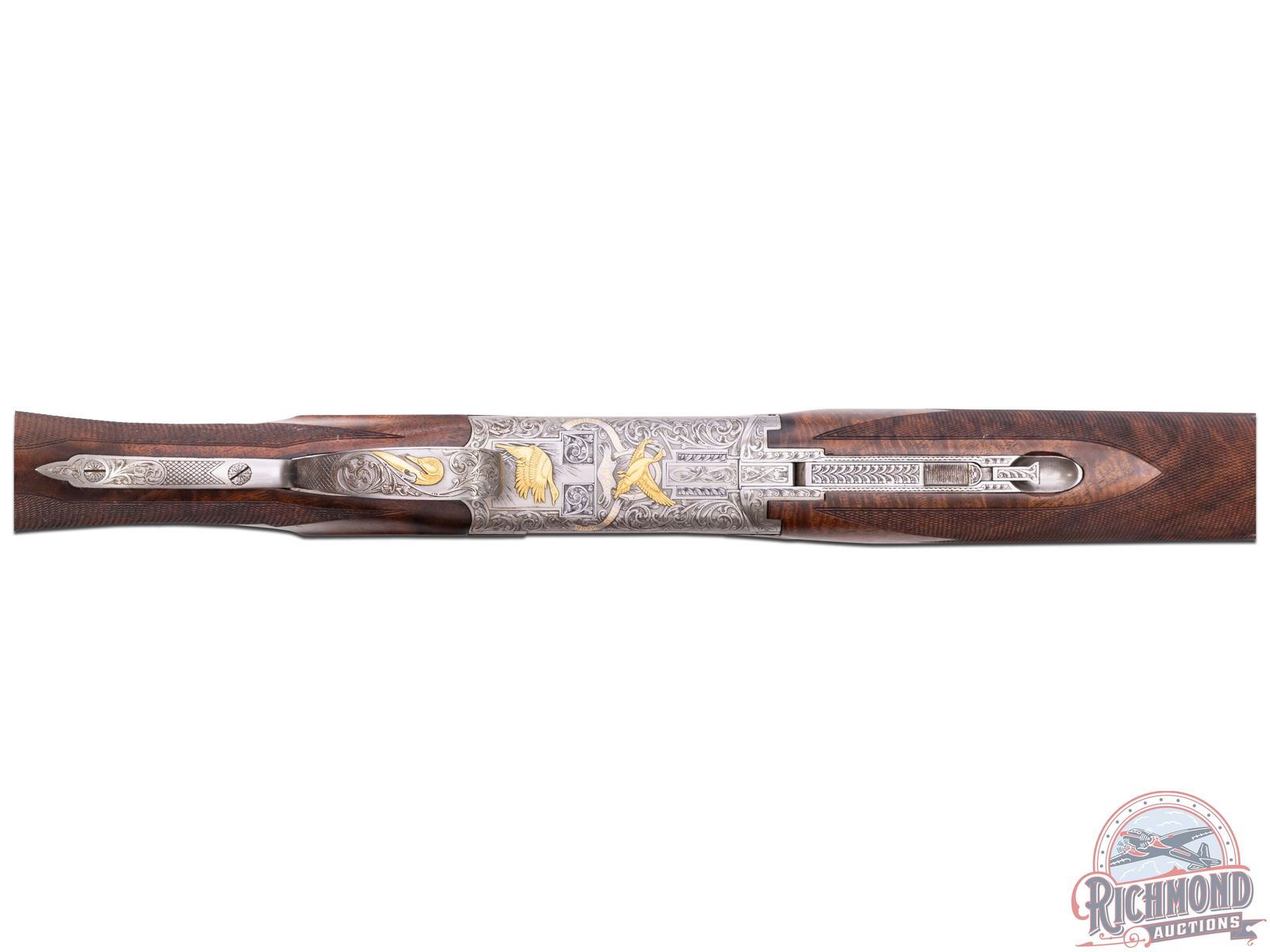Made in Herstal, Belgium by Browning in 1981 and marketed only in 1982 until supplies were gone in 1982. This gun is number 100 of 500 made of this edition. 28" blued Ported Special Steel barrels with ventilated rib, twin bead Hi-Viz sights, ejectors, and Invector chokes. Barrel has Browning Utah and Montreal address markings, along with steel and patents in 12 gauge caliber with 2-3/4" chambers. Satin gray finished receiver with floral engraving done by Jose Baerten with right side having a floral background with two gold ducks in flight with oval scene having a gold line border. Left side features two gold ducks in flight in oval gold border with panel signed "J. Baerten". Bottom has two gold ducks with floral background with "Pintail Anas Acuta" phrase in gold with "100 of 500" in gold. Action has gold washed single selective trigger with top tang safety and selector. Trigger is protected by satin finished floral trigger guard with gold "Duck Head" on bow. Walnut figured fine checkered round knob long tang pistol grip stock in floral pattern with skip-line checkered wood butt. Matching sporting style attached checkered forearm with latch release. Comes in fitted black walnut case with brass hardware and extra Invector choke tube and wrench. LOP: 14-1/4". DAC: 1-1/2". DAH: 2". CALIBER: 12 GA. S/N: 8H4PZ00100. FFL STATUS: Modern.