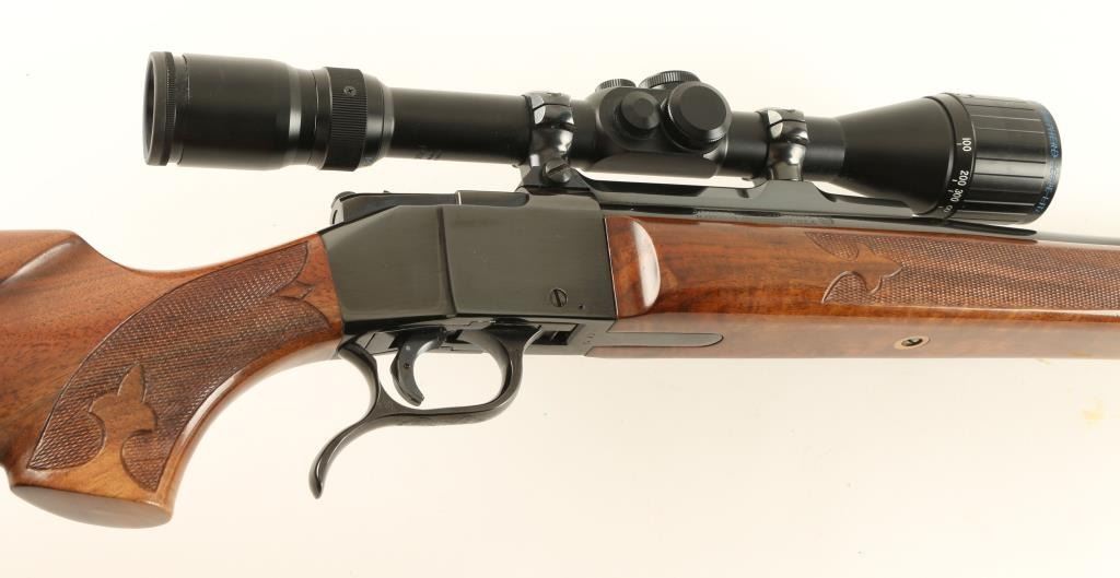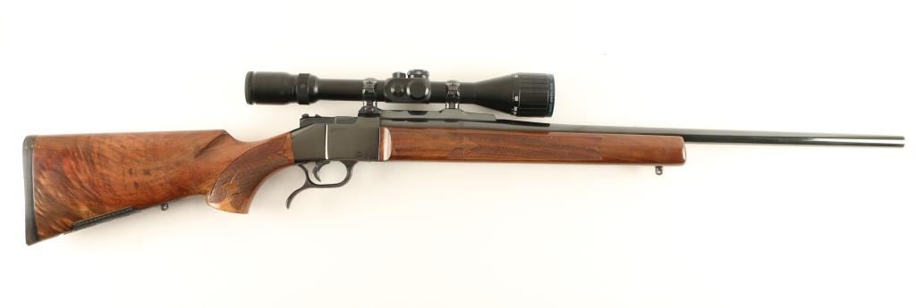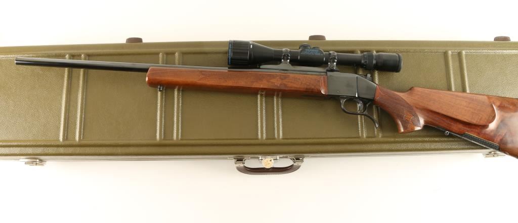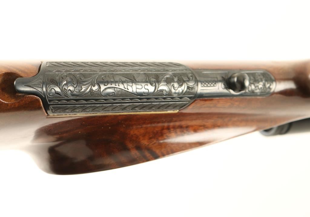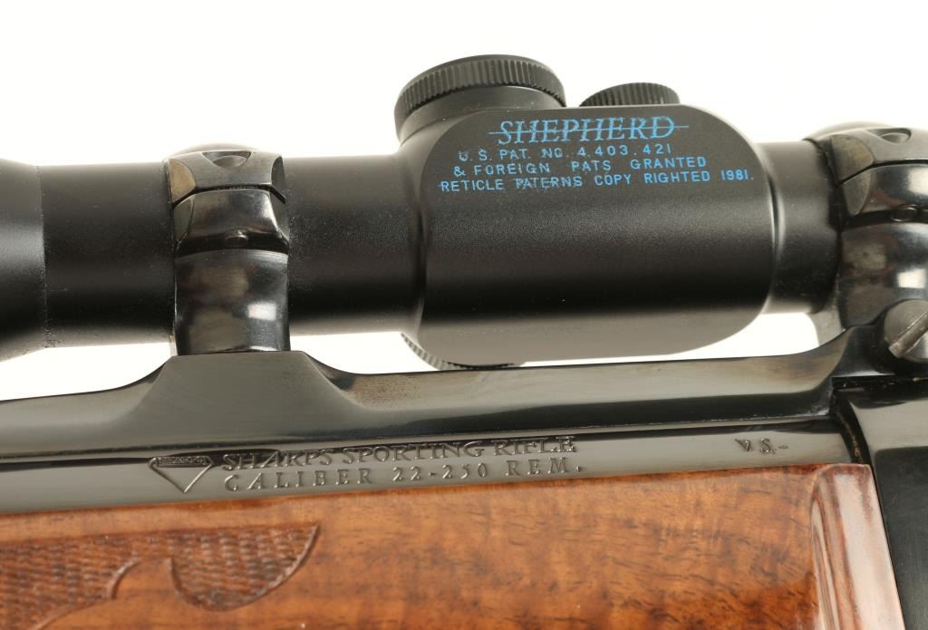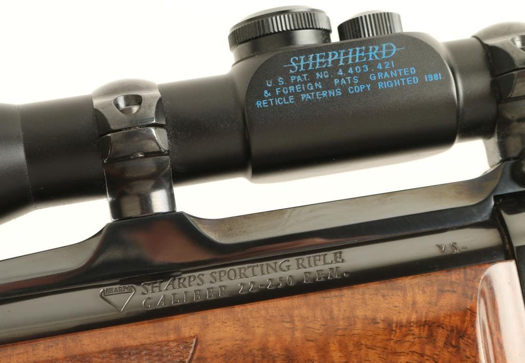 Exceptional and rare Colt Sharps Sporting Rifle single shot falling block rifle chambered in .22-250 Remington. 1 of only 500 reported to have been produced from 1970 - 1972. Features a high polish blued finish, 26" tapered barrel, no sights, Shepherd 3x-10x scope with dual reticle, single set trigger, manual safety, scroll hand engraved lever and cartridge compartment door, swivel studs, select grade figured and checkered forend and Mont Carlo style shoulder stock with factory recoil pad. Includes a factory hard case un-serialized to the gun and extensive documentation as to the history of the rifle. Rifle shows little to no wear on the metal surfaces and retains approximately 70% of the varnish on the wood stocks. Action is smooth, bore is pristine and wood stocks are fine with only a single scratch observed. Condition is excellent. ***Modern Firearm***