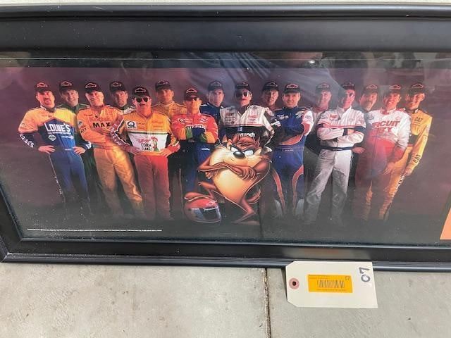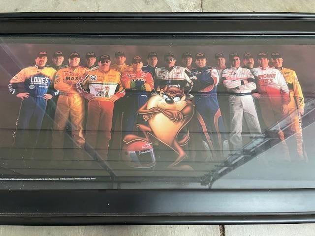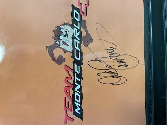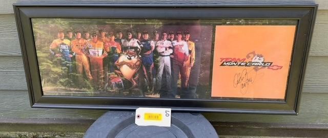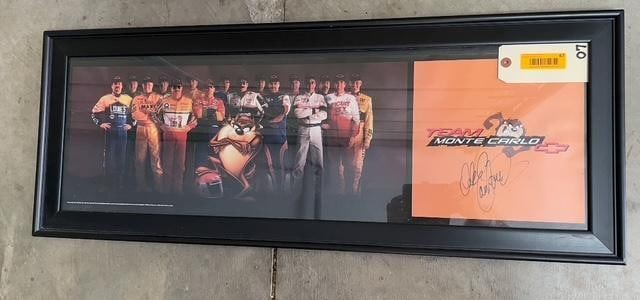 *Rare* Dale Ernhardt Signed Vintage Nascar Team Monte Carlo Tasmanian Devil Poster from 1998. It is displayed in a Wood and Glass Frame that measures 37" Wide x 13" Tall. COLLECTIBLE NASCAR POSTERS