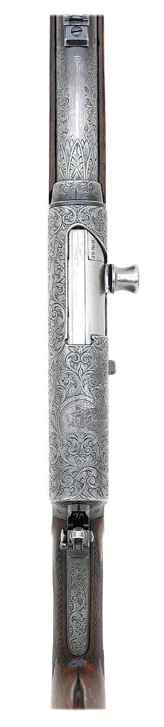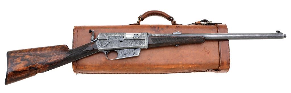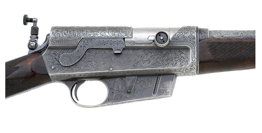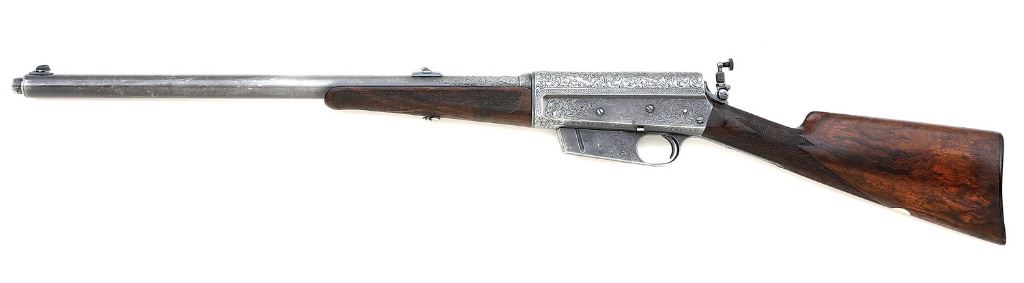 serial #21982, 35 Remington, 22'' barrel with a bright very good plus bore showing a little mild oxidation and frosting in the grooves with otherwise strong rifling throughout. This is a rather early F-Grade (also known as No. 6 or Premier Grade) made in early 1911. The rifle has seen honest use by its former owners who obviously appreciated it as both a fine work of art and a practical tool. Nevertheless, this example remains a fine showcase of Remington's wonderful factory engravers, renowned for their bold style and meticulous detail. The metal surfaces retain perhaps 30% original blue scattered about the more protected areas with overall toning to a pleasant mix of smoky gray and mild gunmetal patina and showing some sparsely scattered thin scratches and other light handling marks from the field. The factory embellishments remain completely intact and crisp showing wonderful flowing foliate scrollwork of the finest quality throughout the action and extending into the barrel jacket shank. This is accented by very fine punch-dot background shading and popular motifs of the time abound including shell-style bordering, starbursts, crosshatching and a nice wide acanthus pattern along the jacket shank. The ''SAFE'' marking lies within a parchment scroll. The lovely game scenes consist of a waterside buck and doe on the left, triumphant bear over a buck on the right and profile of a bear head atop the action. The deluxe checkered straight grip Circassian walnut buttstock and forend remain in about very good plus condition showing no signs of refinishing or cleaning, but just maintaining an honest appearance overall with signs of moderate use commensurate with the balance of the arm, the expected scattered dings and smoothing of the checkering overall. The sides of the buttstock exhibit some wonderful rich grain figure and a great deal of original varnish, the gold monogram plate along the toe line engraved with no doubt the original owner's information ''E. A. / WOODMAN / NEWPORT / ORE.'' The original hard rubber buttplate is intact showing a thin 2'' crack along its left edge and some dings at the toe. The rifle is sighted with a Lyman receiver sight with medium aperture disc, flip-up white diamond rear sight and Marble's Sheard brass bead front sight. The rifle also includes a very rare original leather case with locking buckle. The case remains in about very fine condition showing some mild staining and scuffs along the exterior, the handle attachments with some small tears forming and scattered areas where the stitching has been repaired. The lid closure strap is a later replacement and there was once a monogram plate in the center of the body that has been lost to the years. The interior is green felt and was probably relined at some point but is otherwise correct with two compartments nicely fitted for the taken-down rifle. This grade of Model 8 rarely comes up for sale and is always desirable; this is a fine honest example for the Remington collector. (13F11696-2) {C&R} (6000/8000)