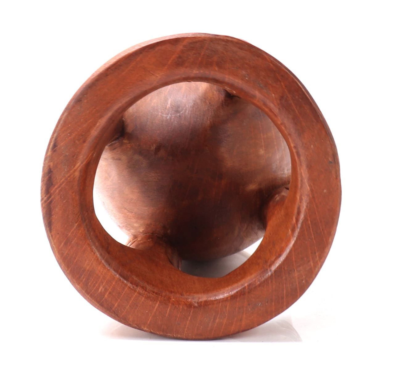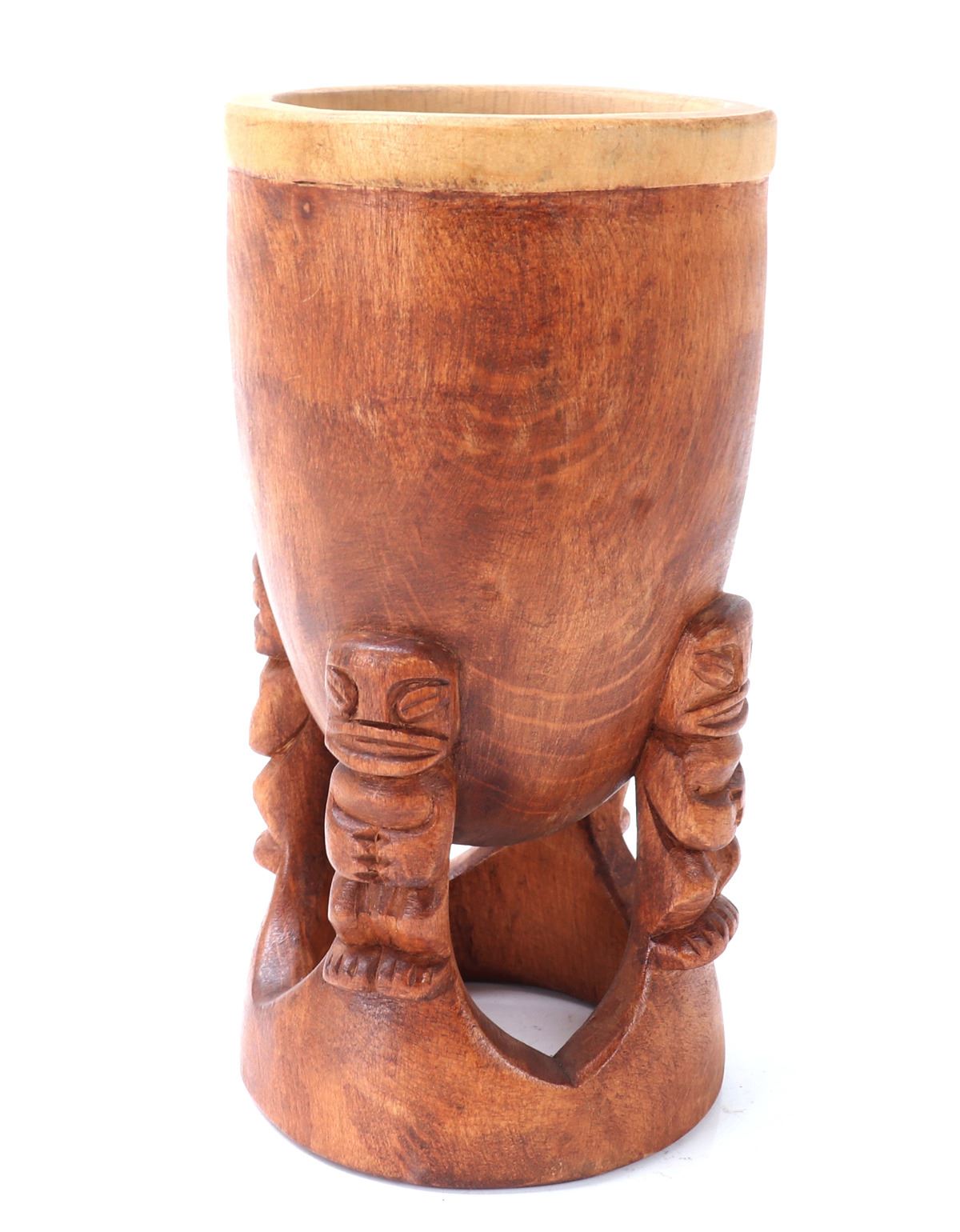 Beautiful and rare hand carved Tahitian tiki bowl with three figures acting as holders of the bowl with a pedestal base. The wood is stained on the to the outside lower half with a bare raw section of wood around the rim. Size 6 1/2" L x 4" W x 4" H, weight 220g. Condition: Good overall condition.