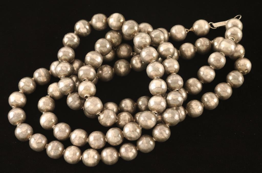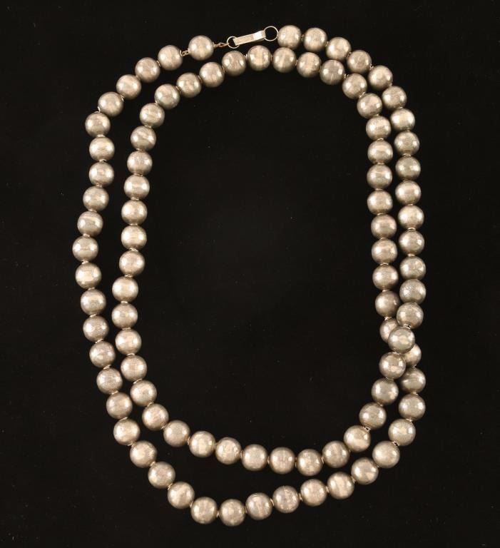 All beads are sandcast half beads and hand soldered together. Seldom found in this length-45" strand. Circa 1890-1930's.