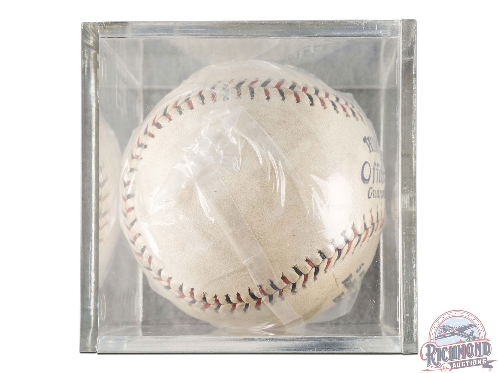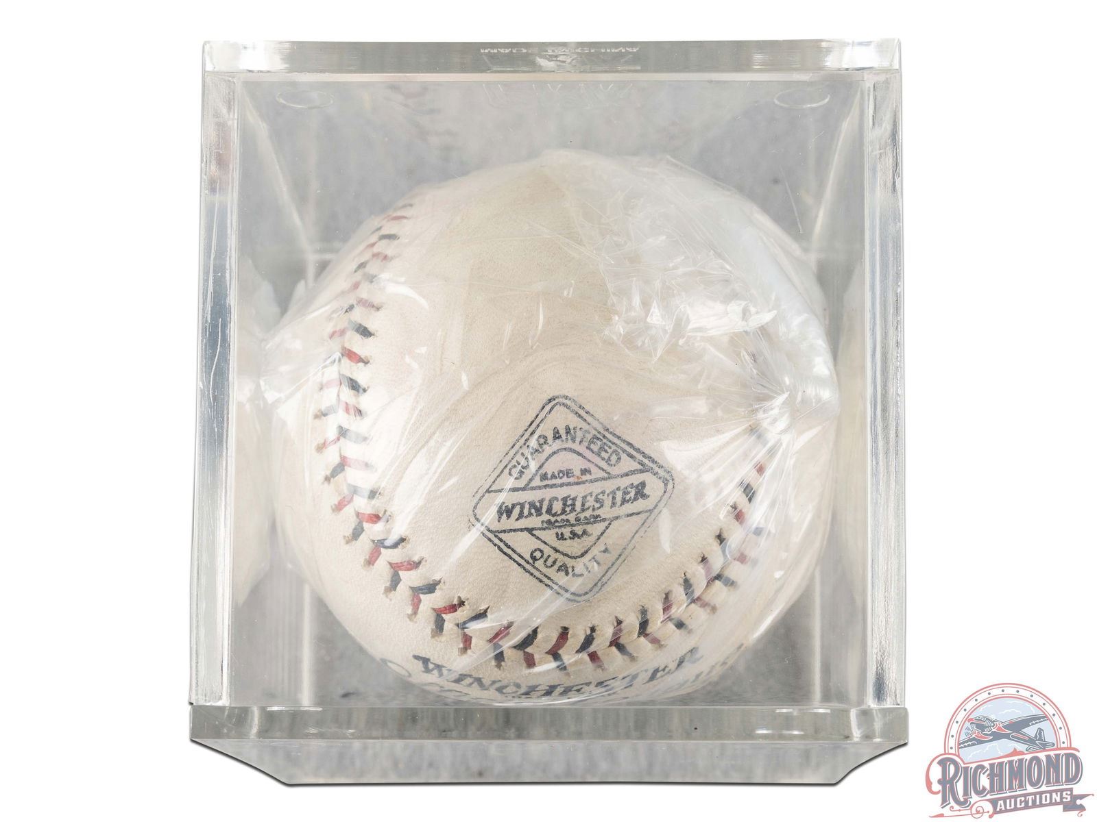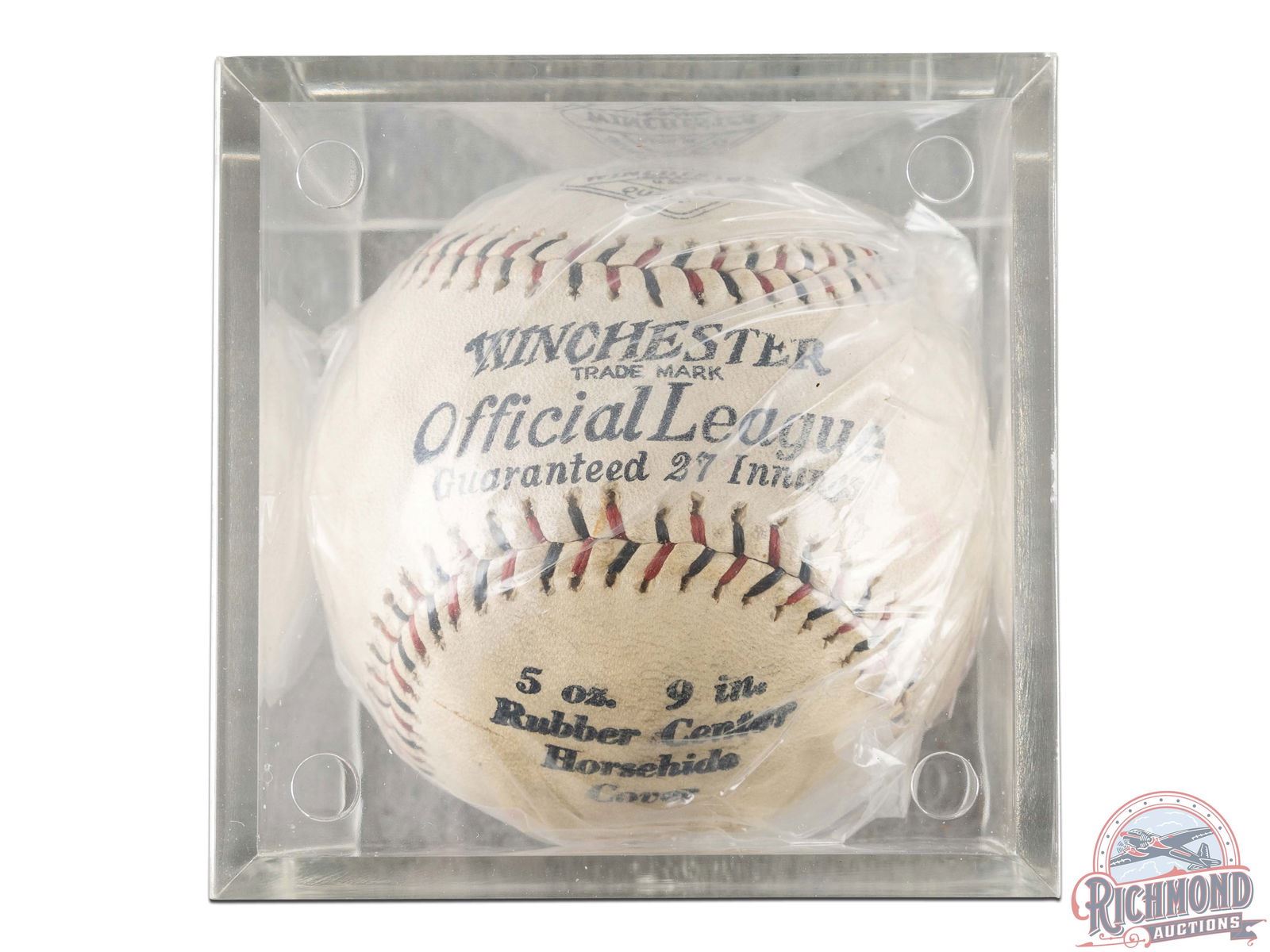 Excellent and hard to find Winchester "Official League, Guaranteed 27 Innings" baseball, model number 2010. Extremely hard to find, especially in this condition. Rubber center with horsehide cover. Stampings are clear and legible. Presents with typical age and storage wear including some discoloration. Overall, it presents extremely well. Wrapped in plastic and stored in acrylic presentation case. Made to National and American League specifications. 2.75" H x 2.75" W.