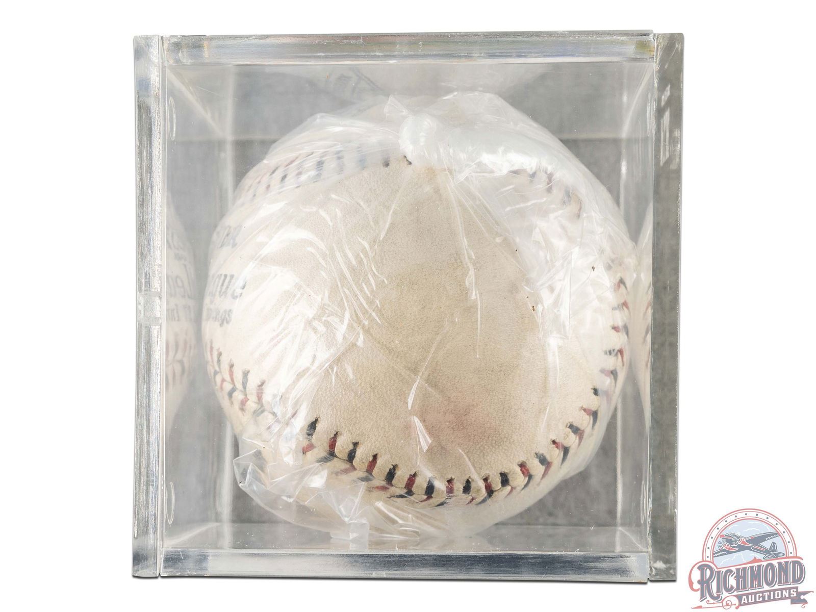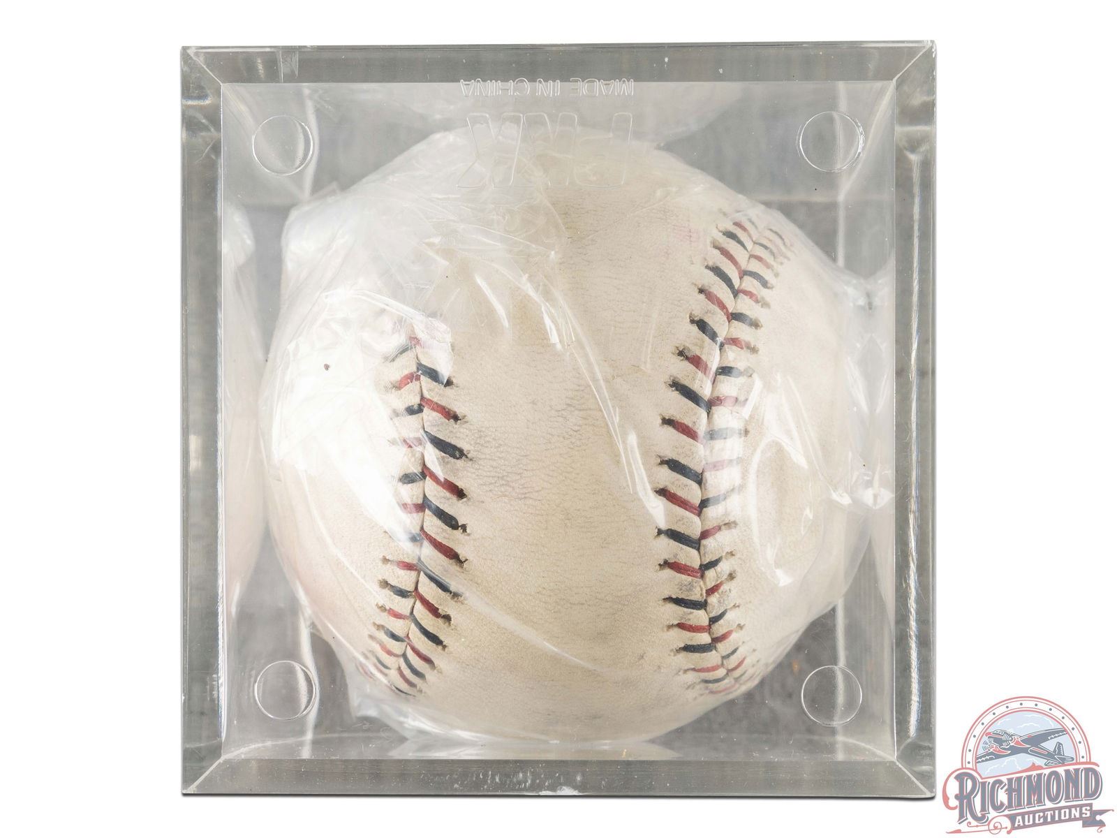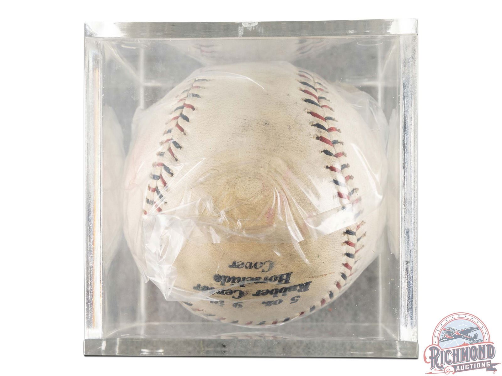 Excellent and hard to find Winchester "Official League, Guaranteed 27 Innings" baseball, model number 2010. Extremely hard to find, especially in this condition. Rubber center with horsehide cover. Stampings are clear and legible. Presents with typical age and storage wear including some discoloration. Overall, it presents extremely well. Wrapped in plastic and stored in acrylic presentation case. Made to National and American League specifications. 2.75" H x 2.75" W.