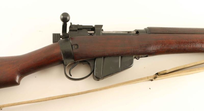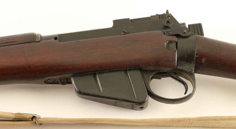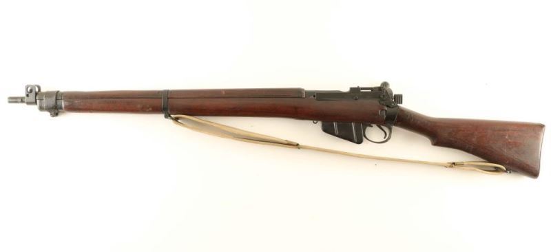 SN: A2088 British military single shot bolt action training rifle chambered in .22 caliber rimfire. Converted from a No 4 rifle by Parker Hale for the Royal Navy circa 1959, with approximately 3,000 built. Features a black painted finish, 25.2" barrel with integral bayonet lugs, shrouded patridge front sight, receiver mounted flip-up aperture rear sight graduated to 1,300 yards with a 25 yard mark, two barrel bands, smooth trigger, hollowed .303 magazine which acts as a brass collector, manual safety on the left side of the receiver, tan canvas sling, integral .303 charge loading guide cuts in the receiver, grooved full-length wood handguard, smooth forend, straight grip shoulder stock and brass trapdoor buttplate. The left side of the the receiver is marked ".22 R.F. N.9 Mk I/P-H 59 A2088." Serial numbers match on the receiver, bolt handle and forend. Rifle retains the majority of it's black finish showing moderate handling marks & wear. Action is sound, the bore is excellent and the wood stocks are very good+. Condition is NRA Very Good. ***C&R Firearm*** From The John F Sukey Collection