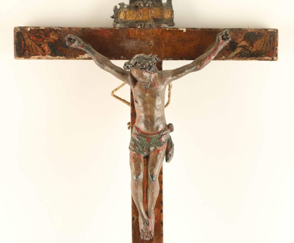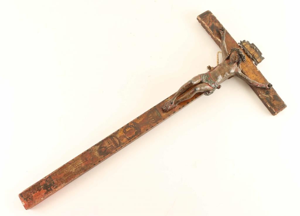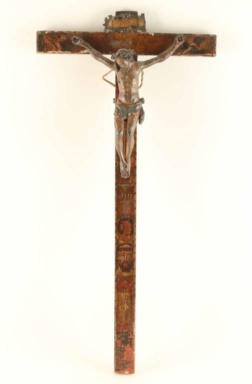 Measures 23" tall, with rare lead cast polychrome figure of Christ. Seldom encountered. Circa early 1800's. In very good+ condition.