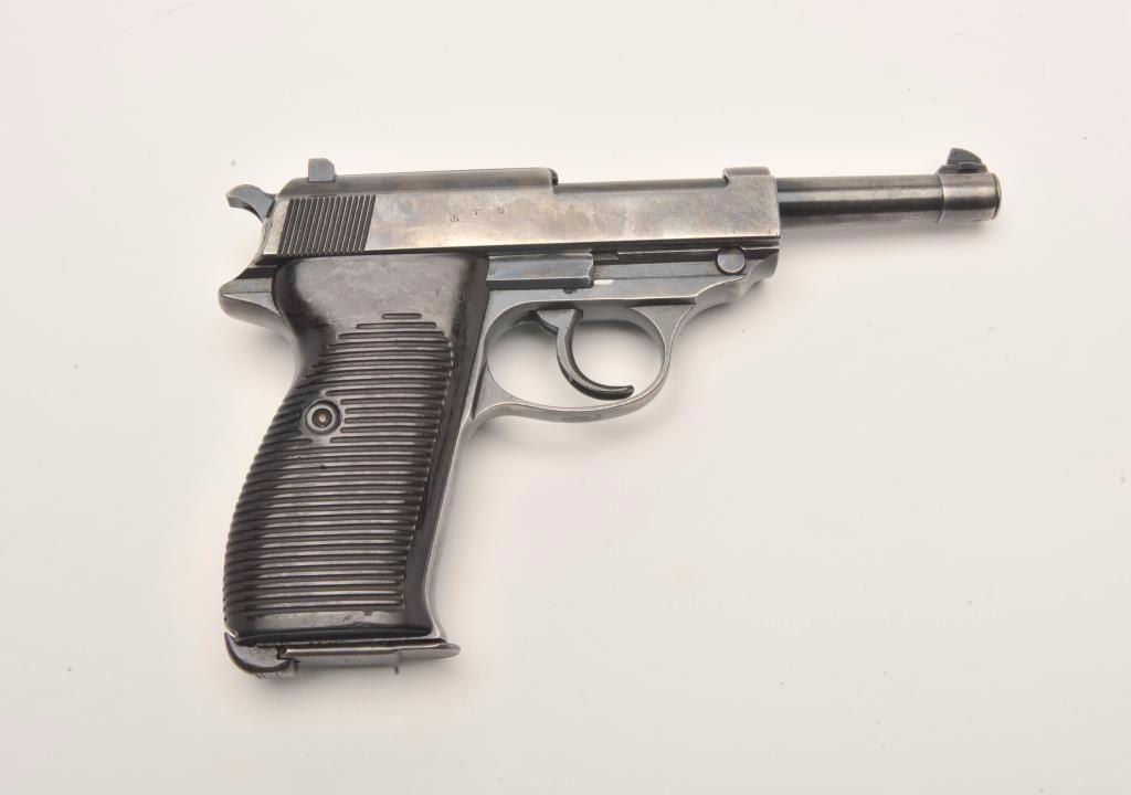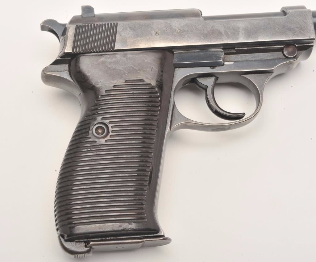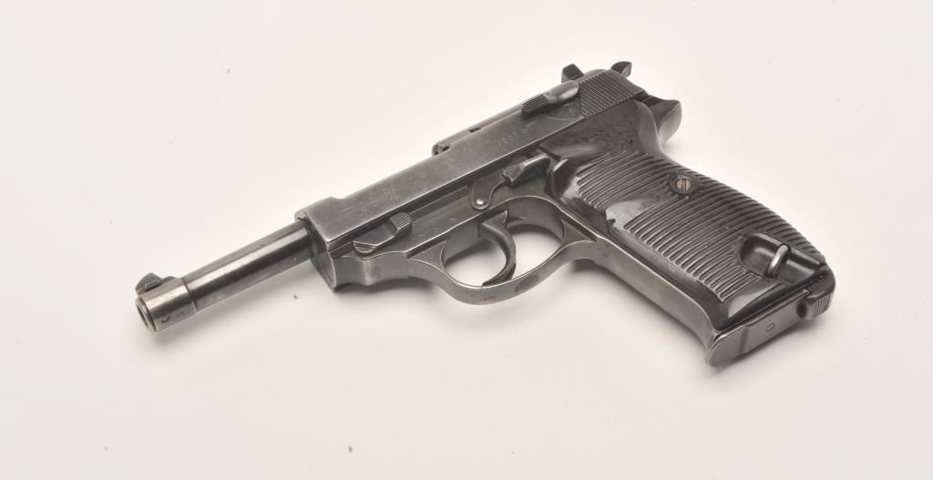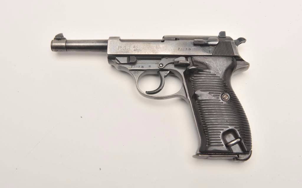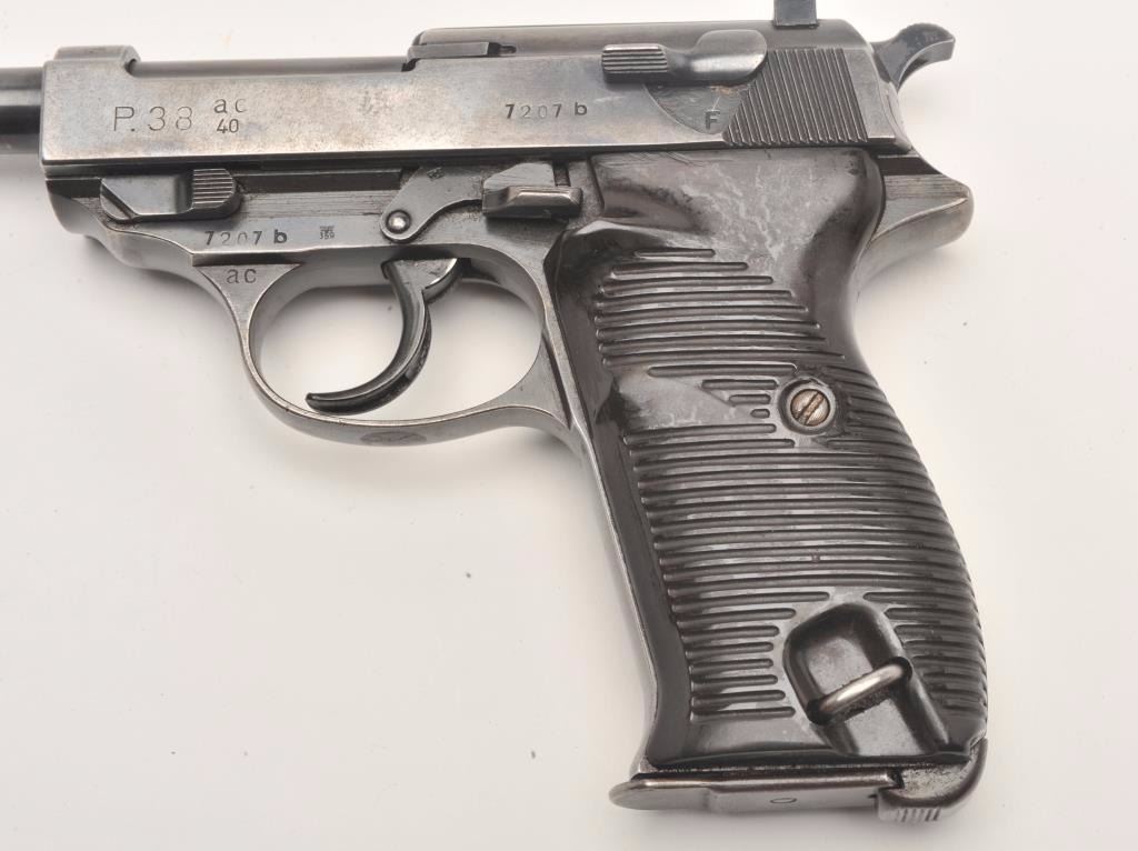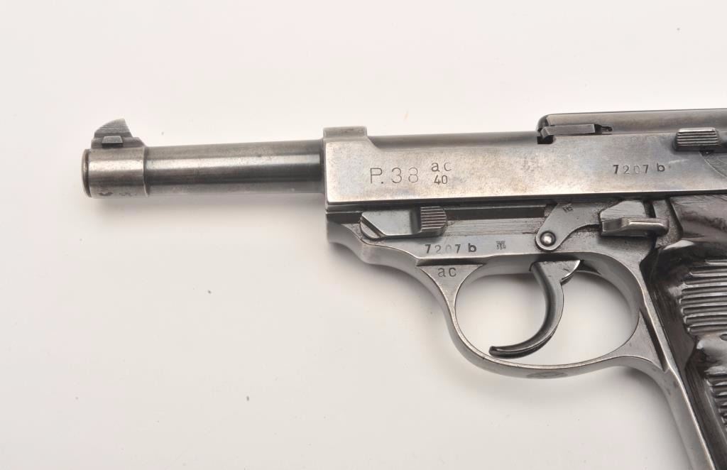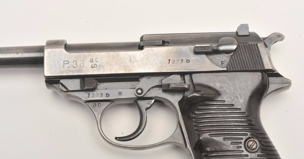 Rare date P-38 semi-automatic pistol, marked “ac 40”, 9mm caliber, 5” barrel, military blued finish, brown grips, S/N 7207b (all matching visible #s; magazine un-numbered); in overall very good + condition displayingconsiderable military finish remaining on metal parts, crisp action, sharp markings including nazi proofed, good bore and very good grips. (C&R/PPT). Est.: $1,250-$2,500.