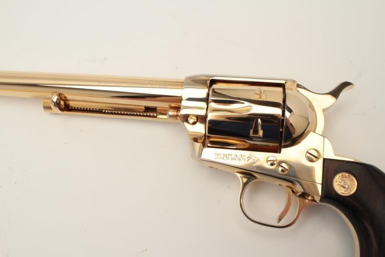 Rare factory gold plated Buntline Special SAA revolver, .45 caliber, 12” barrel, wood medallion grips, S/N 0148WE, (barrel number BB3620) in overall excellent condition showing little handling; approximately 99%+original finish, fine bore, action, markings and grips. (Modern/PPT). Est.: $2,500-$5,000.