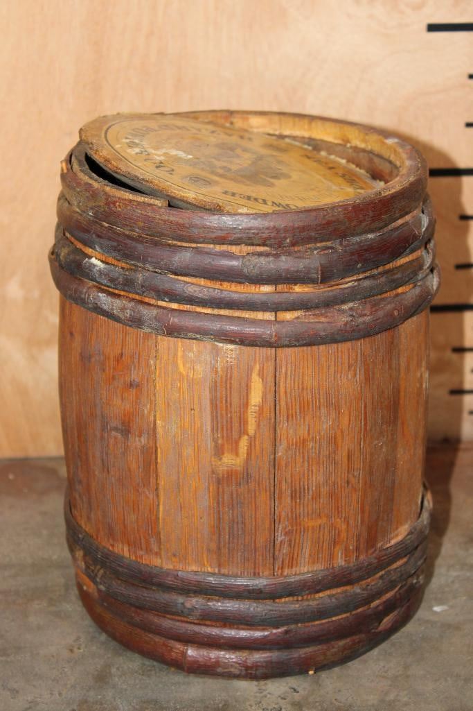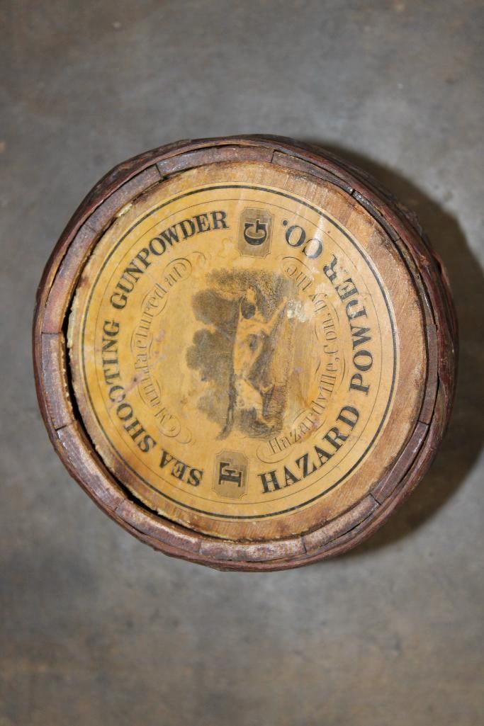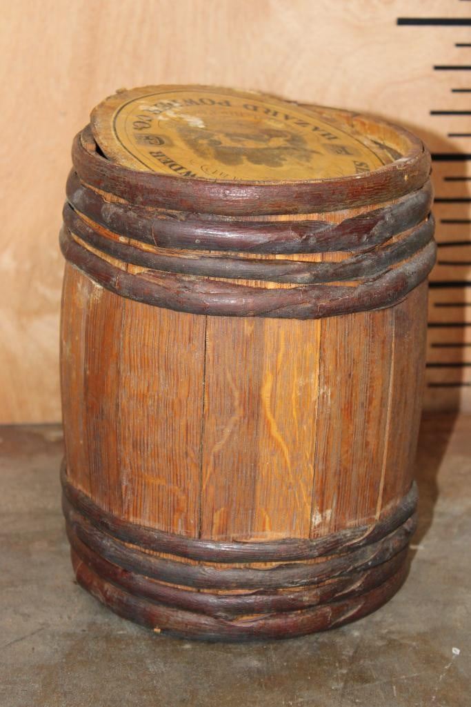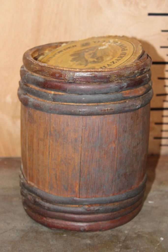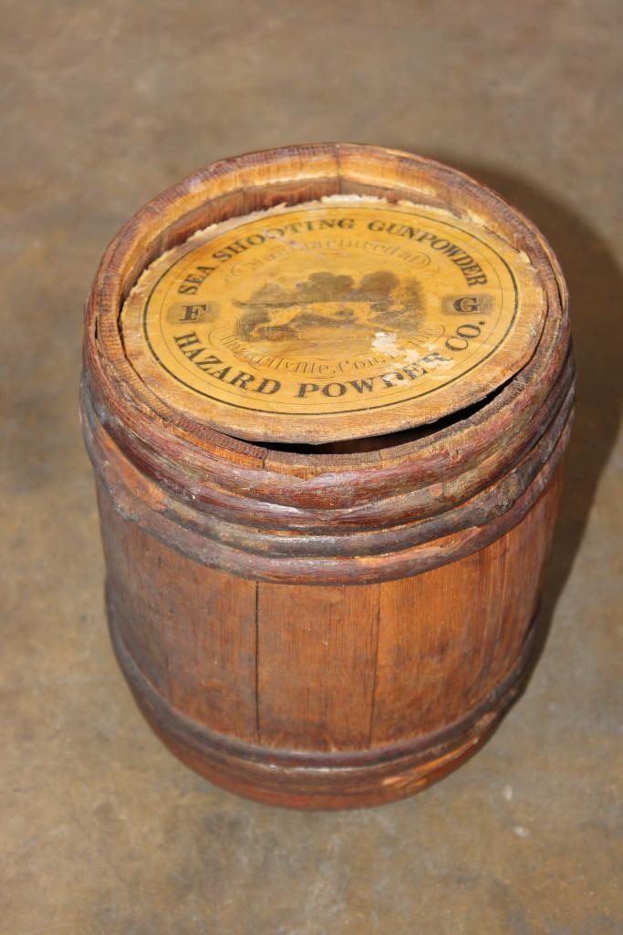 *Rarely Seen* Antique Original Hazard Powder Co. Sea Shooting Gunpowder Keg or Barrel. These were produced from 1835-1870's. It measures 8.5" Tall x 6.75" in Diameter. The Total Weight is 1.40 lbs and it is missing the cork end or bottom of the keg. COLLECTIBLE ANTIQUE HUNTING AND AMMO