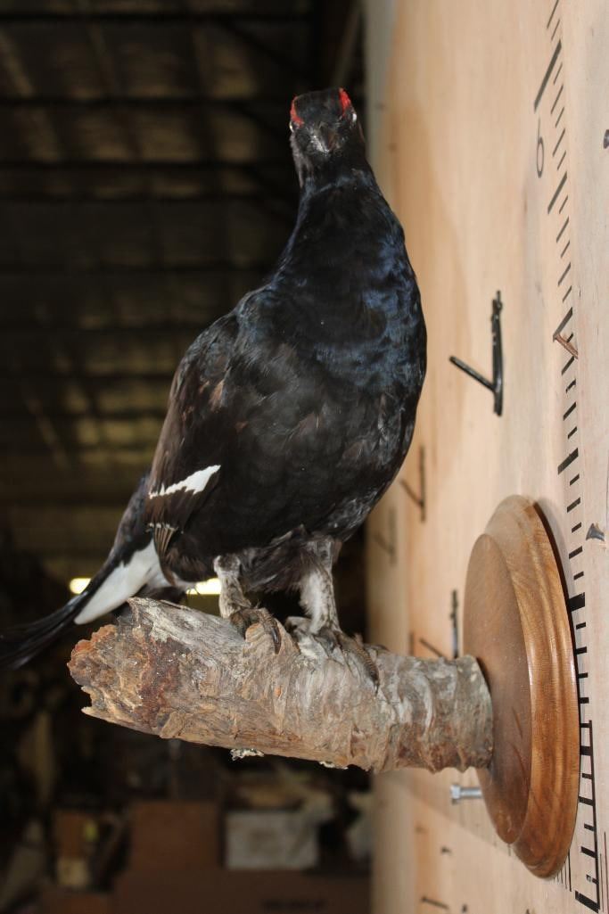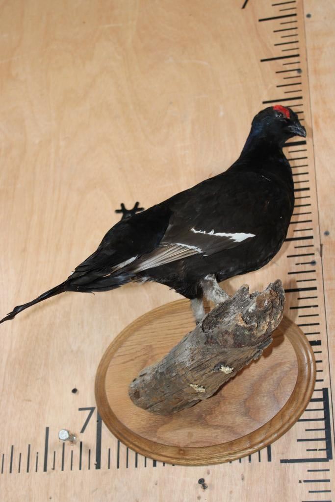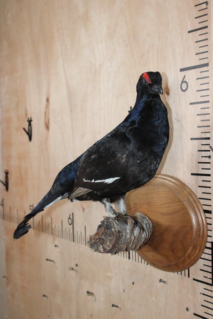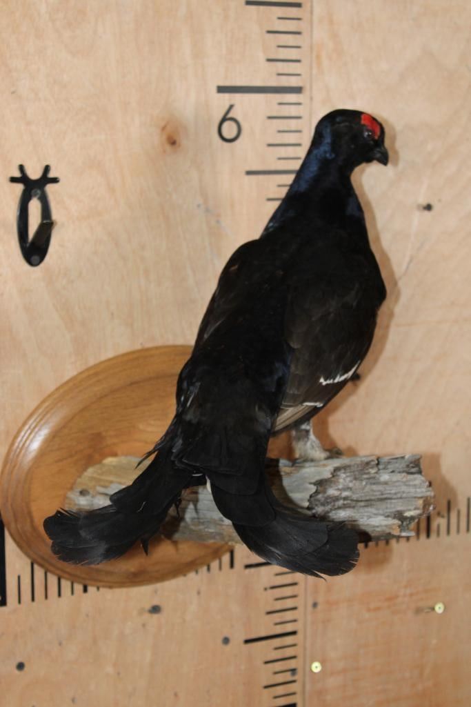 Very Nice and Clean *Rarely Seen* Life-sized BLACK GROUSE, Native to Eurasia. It is mounted on a Tree Branch and Wood Plaque Base. The Total Mount measures 13" Long x 18" Tall x 14" Depth. It is in Very Good Condition. TAXIDERMY BIRDS