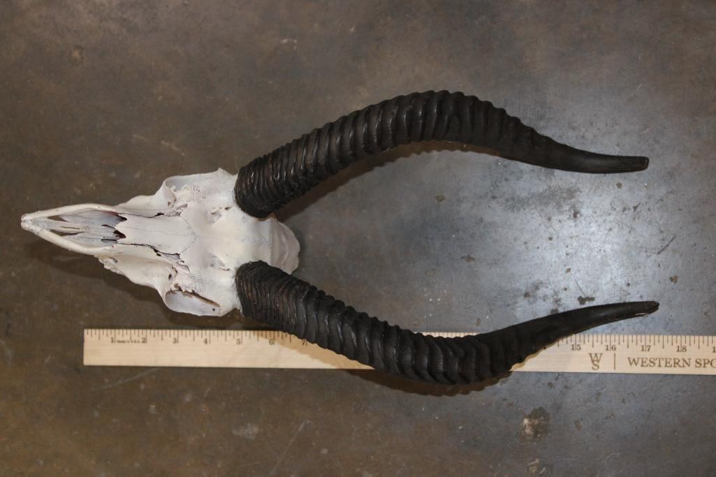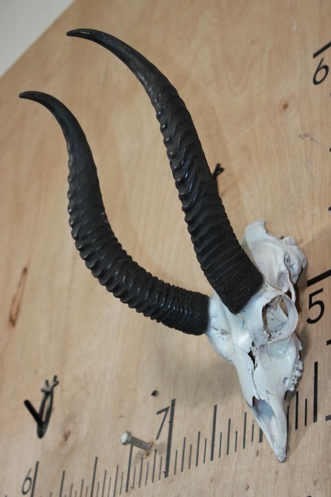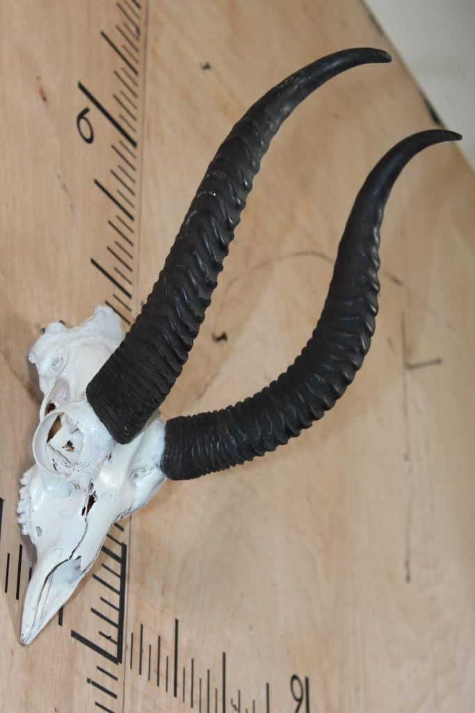 *Rarely Seen* GERENUK Skull. The Skull only has been painted white. The Left Horn measures 14.25" Long and the Right Horn measures 14" Long. It is missing 2 Teeth. TAXIDERMY SKULLS