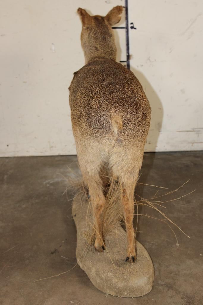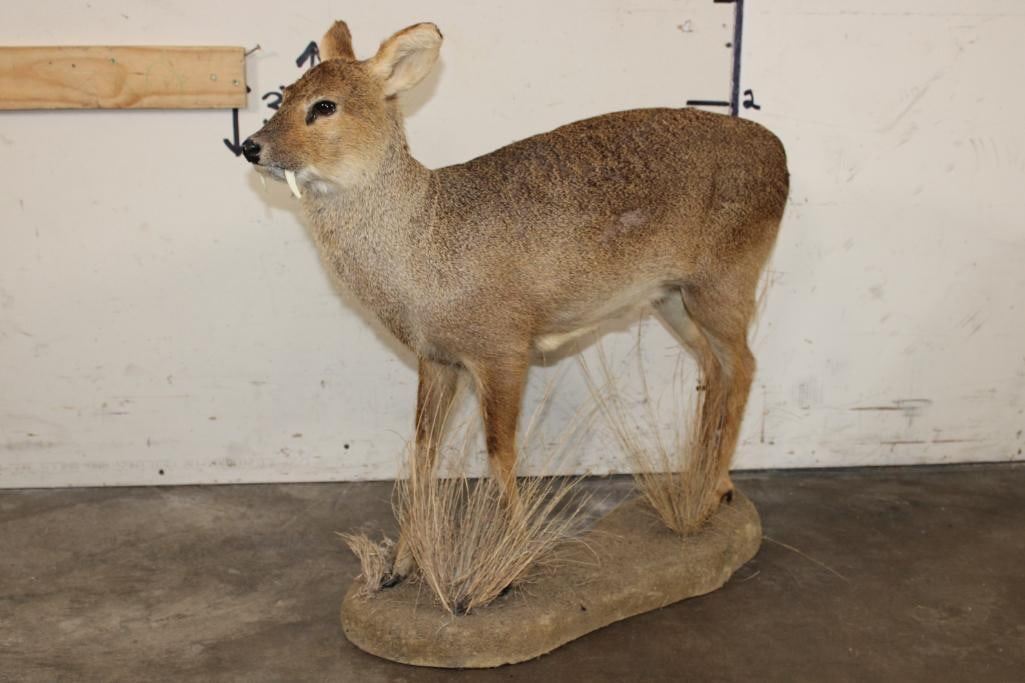 Very Nice, Clean, and *Rarely Seen* Life-sized CHINESE WATER DEER. It is mounted on a simulated rock base that measures 32" Long x 9" Wide x 30" Tall. It is in Very Good Condition. Chinese Water Deer are also known as the "vampire deer" because of its Fangs! Instead of growing antlers they grow tusks up to an average of 2" long that resemble impressive, and dangerous fangs. TAXIDERMY