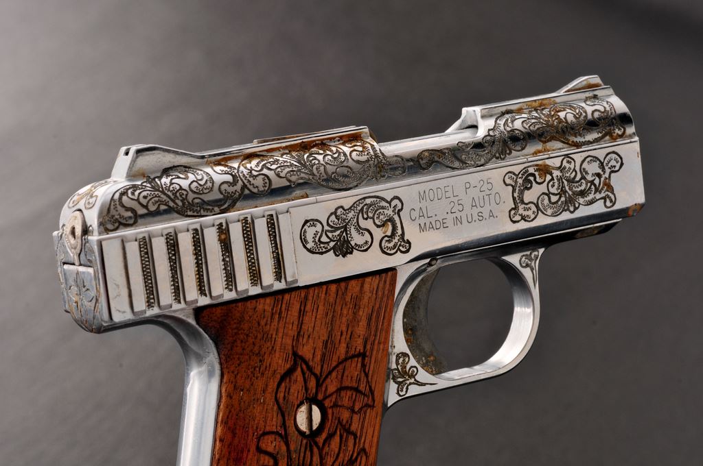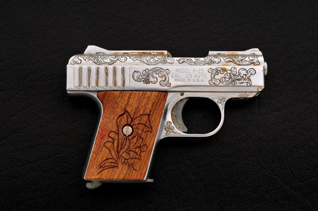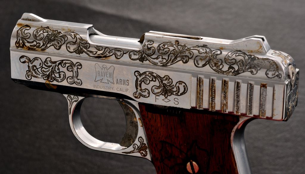 Raven P-25 Semi-Automatic Pistol, #397344, .25 ACP cal., 2-7/16'' barrel, chrome finish, smooth walnut grips, with standard fixed sights, and one 6-round magazine. Condition is very good retaining most of the chrome finish. Right side of slide with some fine blistering to the chrome finish. Front strap with a spot of cleaned pitting. Grips show only a few small handling marks. Action is smooth with an excellent bore. Est.: $50-$100. (Modern/PPT)