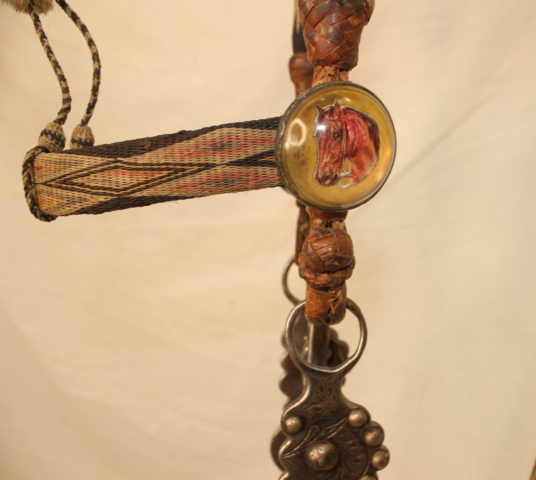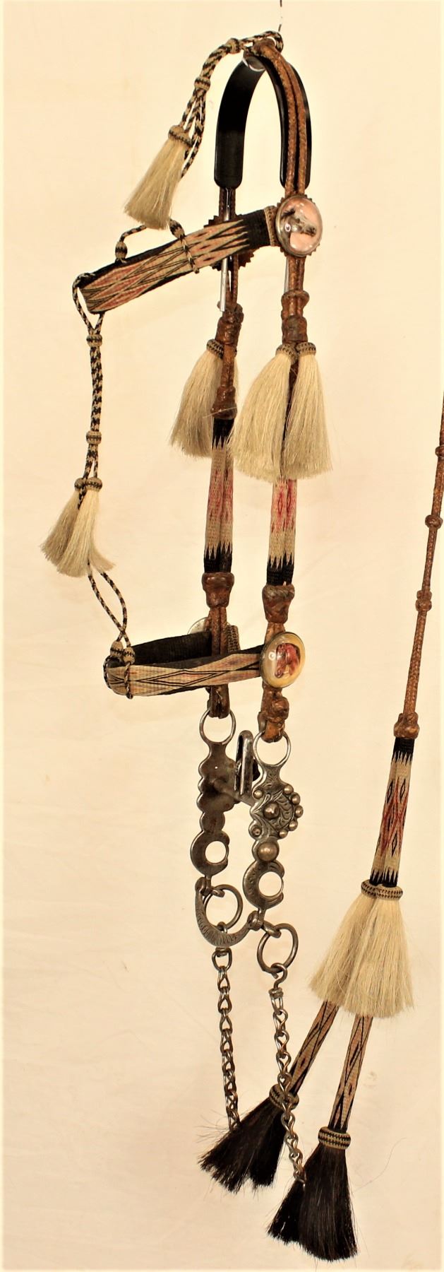 Colorful Wyoming prison horsehair bridle with bold geometrically hitched horsehair, braided leather, eye appealing horsehead glass rosettes, and finished with a super clean silver inlaid Buerman halfbreed bit.
