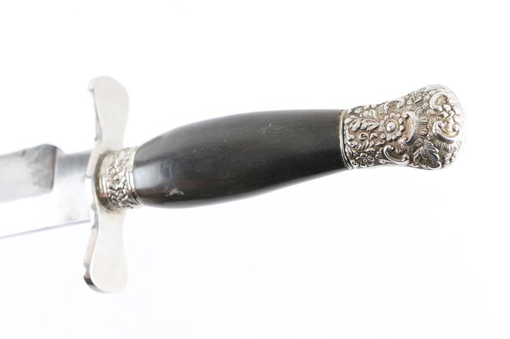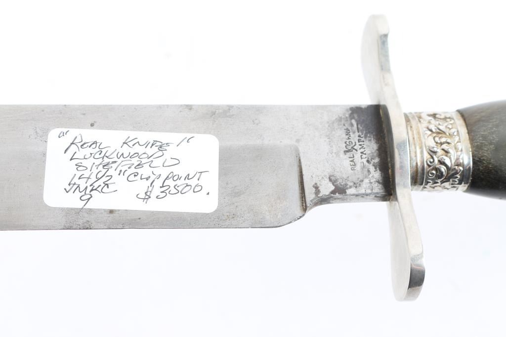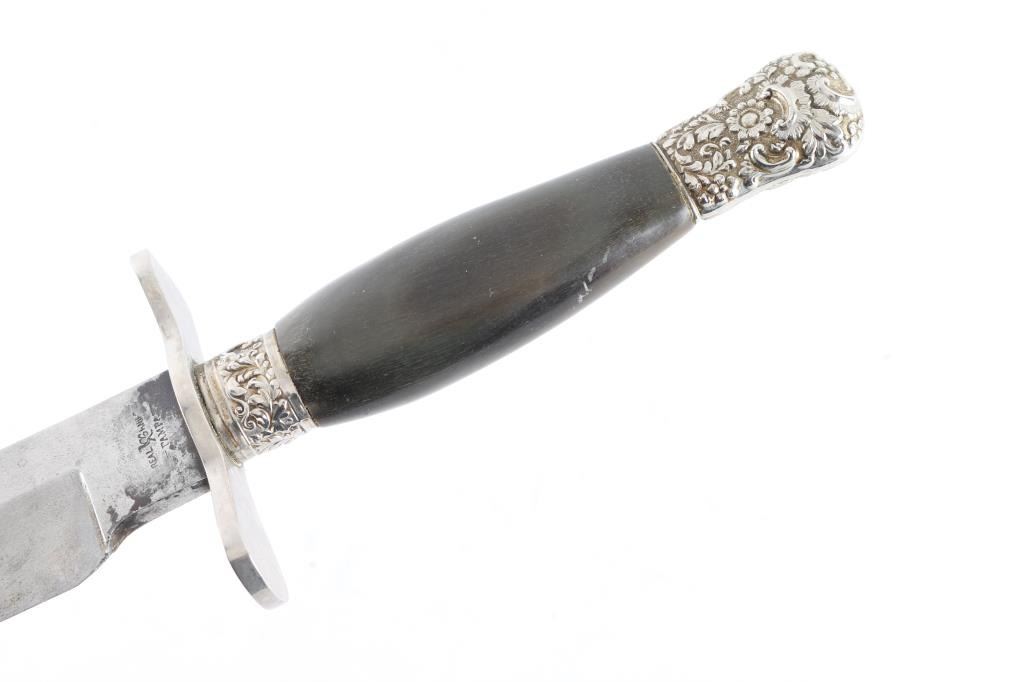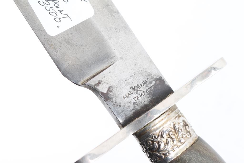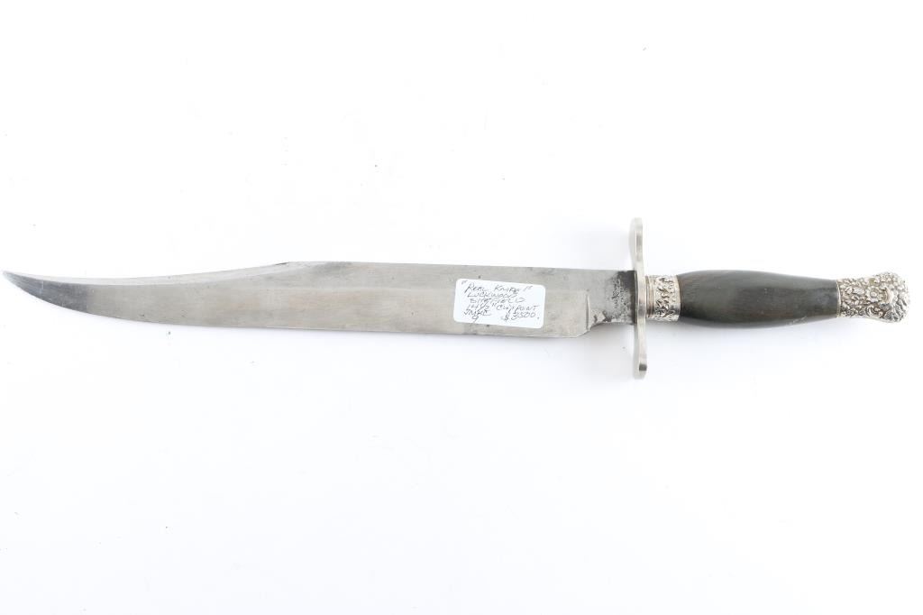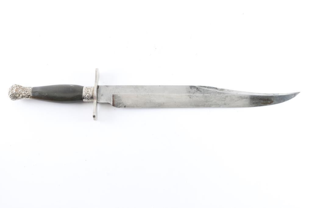Huge clip point Bowie knife, 19th Century. Features a 14 1/2" blade, 20 3/4" overall. Marked "Real Knife Pampa" on ricasso. Fancy mounts and horn grip. Exported from South America. Minor staining and slight pitting on blade. Crisp markings Very good to Fine Condition. From the Joseph Musso Collection