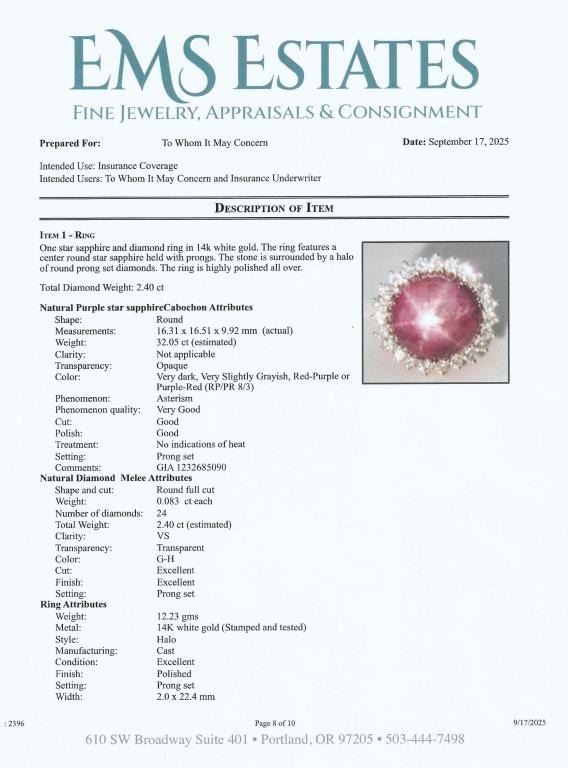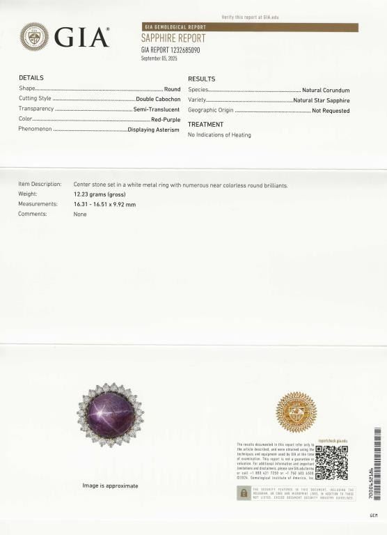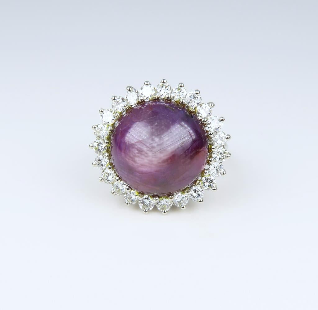 Spectacular G.I.A. Certified Rare Purple Red Star Sapphire and Diamond Ring featuring a 100% Natural, NO Treatment round cabochon Sapphire weighing approx. 32.00 carats and framed by 24 round “IDEAL cut” Diamonds weighing approx. 2.40 carats with G-H colors and VS clarity. Gems set in a glamorous 14 karat white gold very heavy custom setting, ring size 6. Star Sapphire is a rare variety of gemstone that exhibits a star-like visual effect (asterism) seen under a single light source. Star Sapphire historically is regarded as strong healing gem that reduces stress, creates inner peace and promotes health. Full Retail Appraisal - $32,000.00.