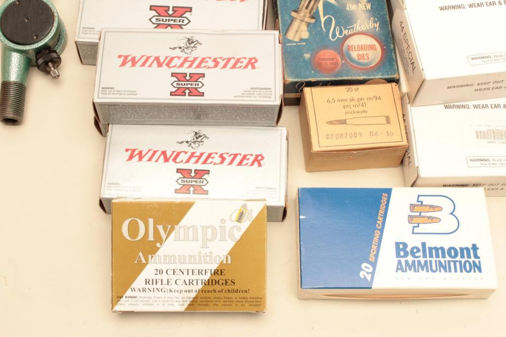 The lot includes RCBS dies in 7mm Rem. Mag., Lee dies in .220 Swift and vintage Weatherby dies in .257 Weatherby. The lot also includes approximately 150 once fired .45 Colt brass, 100 each .44 Special, 40 each 38-55, 40 each 30-30 and other assorted brass. Additionally, the lot includes a new RCBS powder measure and two new in the box Thunder 29 hearing protectors. Est.: $100-$200.