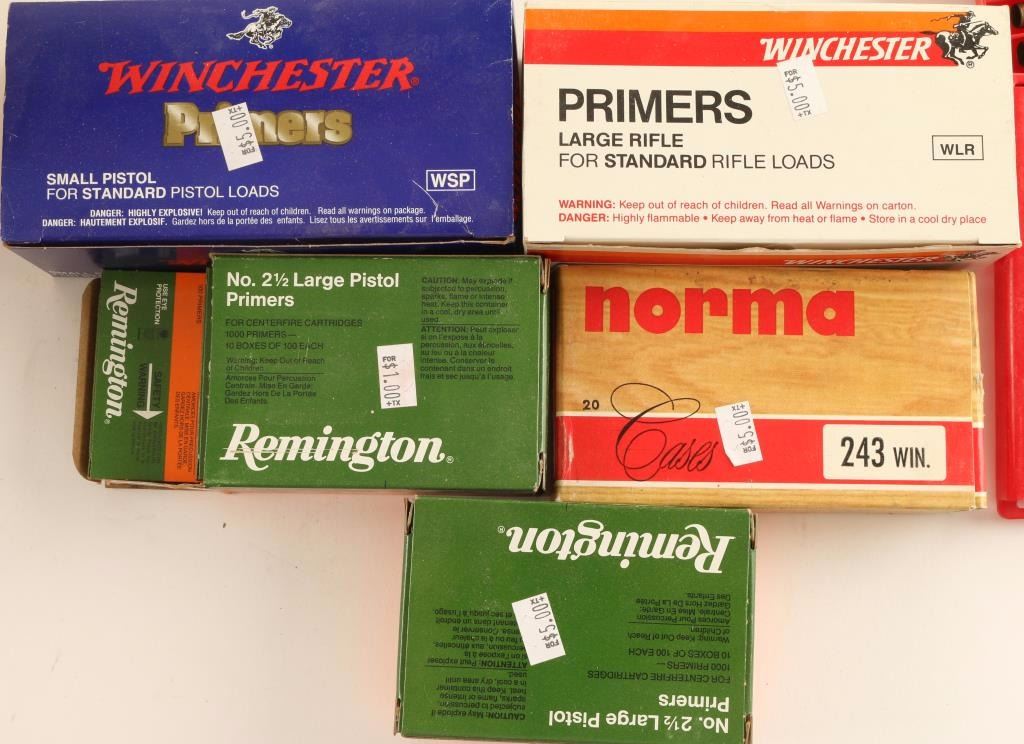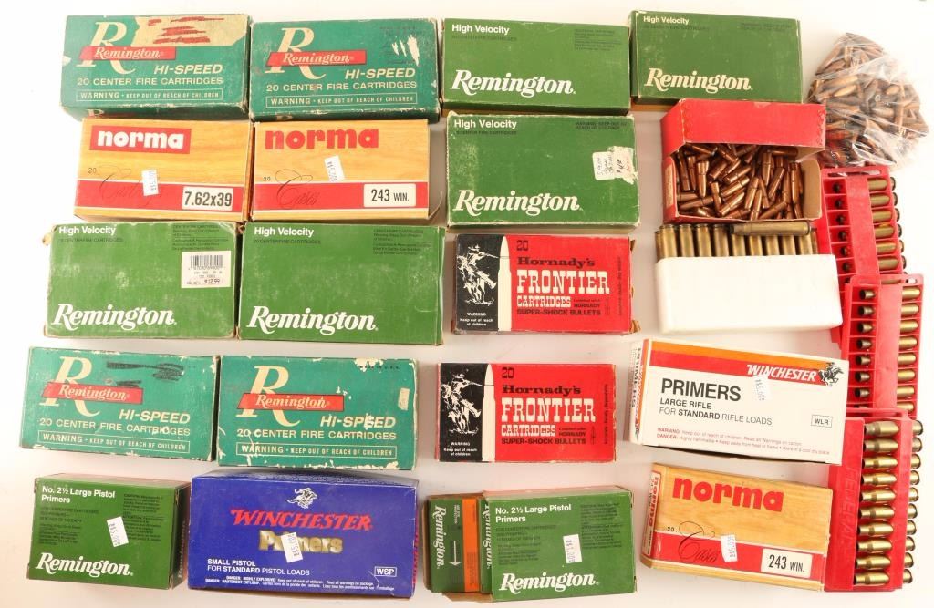 Primers for large rifles, small pistols, large pistols, pistol loads, Remington 243 Win cartridges, Hornady 7mm bullets, Hornady Frontier 30-30 cartridges, brass, Hornady 30 Ca. bullets, and much more.