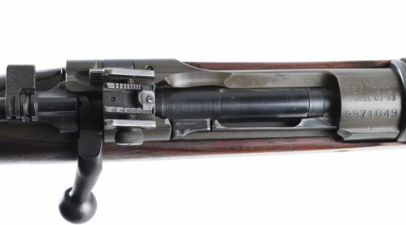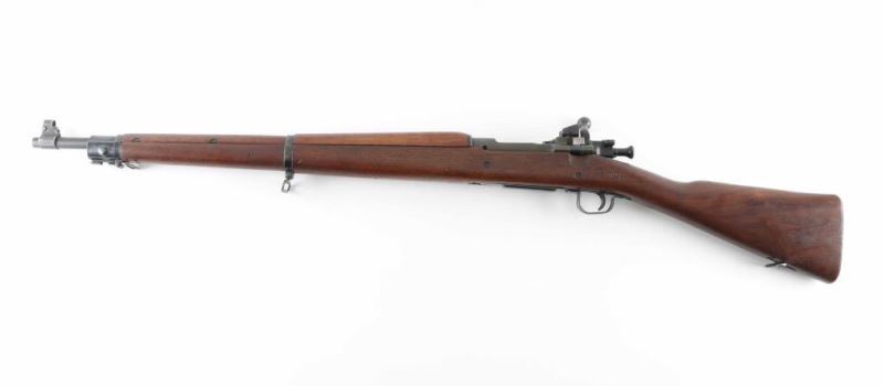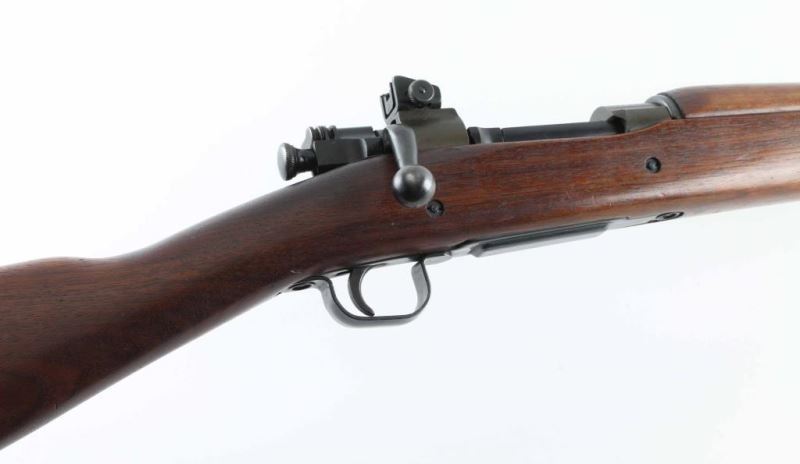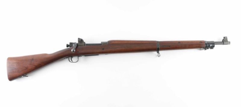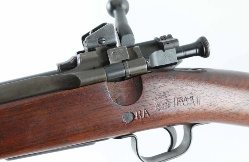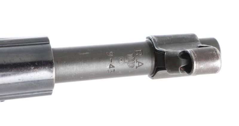 US WWII era military bolt action rifle manufactured circa 1943. Features parkerized finish, walnut shoulder stock with straight wrist, walnut handguard, 24" barrel, blade front sight with protective cover, adjustable peep rear sight mounted to receiver, bent bolt handle, manual safety, magazine cut-off switch, sling swivels, stacking swivel, butt trap with hinged cover, checkered flat steel buttplate. Bottom metal and forward bands are blued stamped steel. Bore is very good condition. Retains 90% finish with bare metal visible around muzzle, where moving parts rub. Stock is very good condition, varnish added, minor dings and handling marks throughout. Barrel marked "RA / (flaming bomb) / 9-43". Stock markings include "RA", "FJA" in box, crossed cannons, "P" in circle. Includes oil bottle and bore pull thru in butt trap. Condition is NRA Very Good+ *** C&R Firearm ***