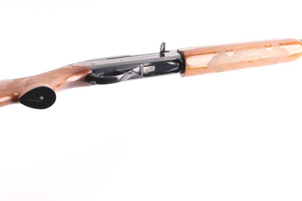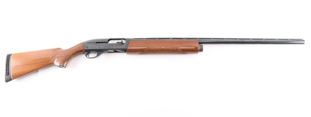 12 Ga. Shotgun. Semi-Automatic. Gas-Operated. Produced 1963-Present. 30" barrel with vented rib. sighting bead. 3" chamber. Full choke. 4-rd tube magazine. Push button safety. Bottom loading, side ejecting. Floral scroll designs on receiver. Bore is excellent. Action is crisp/tight. Blued finish is excellent, a couple of very minor scratches. Checkered walnut stock and forearm are very good with very minor scratches. Black rubber Remington recoil pad. LOP is 14".